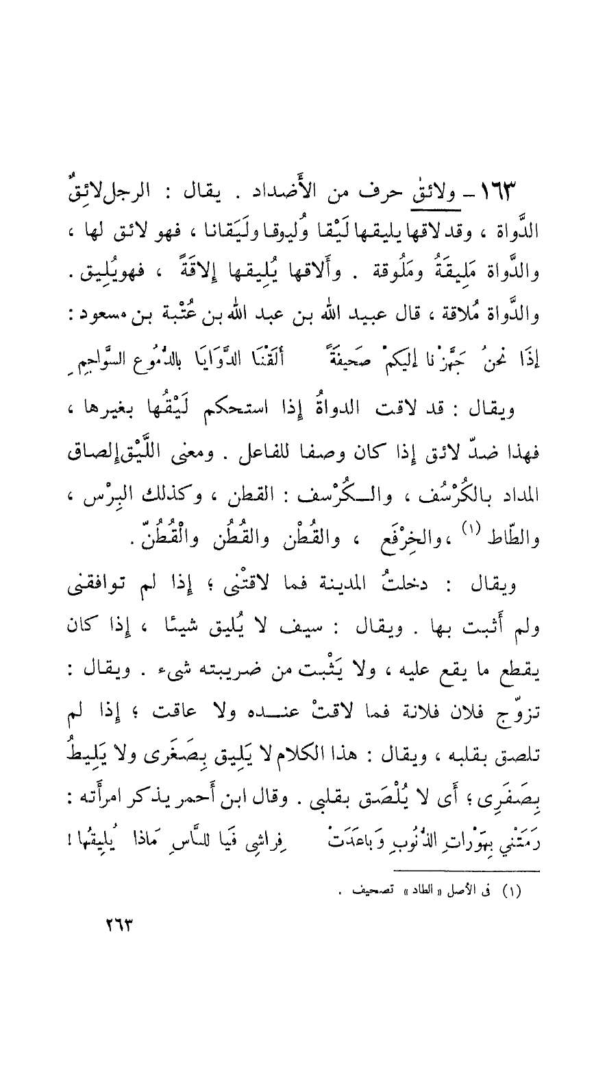 163 - ولائق حرف من الأَضْداد؛ يقال: الرَّجُل لائقُ الدَّواة، وقد لاقها يليقها لَيْقاً ولُيوقاً ولَيَقاناً، فهو لائق لها، والدَّواة مَلِيقَةُ وَمَلُوقة. وأَلاقها يُلِيقها إِلاقَةً، فهو يُلِيق. والدَّواة مُلاقة، قال أَبو عبيد الله بن عبد الله بن عُتْبة بن مسعود: