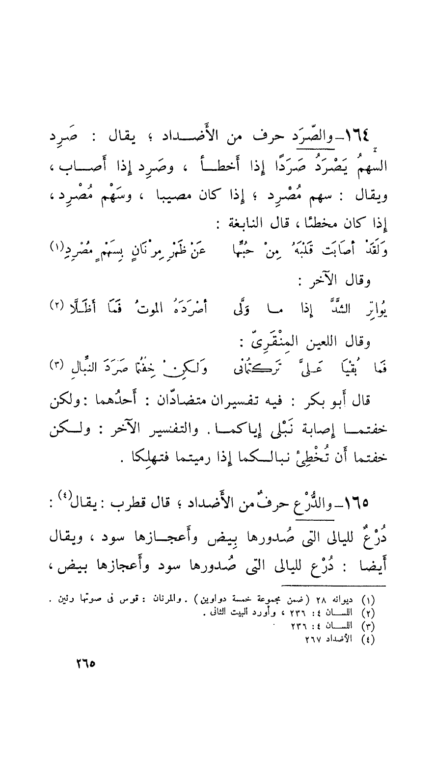 164 - والصَّرَد حرف من الأَضْداد؛ يقال: صَرِد السَّهمُ يَصْرَدُ إِذا أَخطأَ، وصَرِد إِذا أَصاب، ويقال: سهم مُصْرِد؛ إِذا كان مصيباً، وسَهْم مُصْرِد، إِذا كان مخطئاً، قال النَّابِغَة: