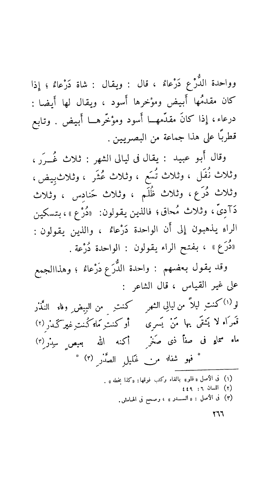 وقالَ أَبو عُبيد: يقال في ليالي الشهر: ثلاث غُرَر، وثلاث نُفَل، وثلاث تُسَع، وثلاث عُشَر، وثلاث بِيض، وثلاث دُرَع، وثلاث ظُلَم، وثلاث حَنادِس، وثلاث دَآدِيّ، وثلاث مُحاق؛ فالَّذين يقولون: دُرْع، بتسكين الراءِ يذهبون إِلى أَنَّ الواحدة دَرْعاءُ، والَّذين يقولون: دُرَع، بفتح الرَّاء يقولون: الواحدة دُرْعة. وقد يقول بعضهم: واحدة الدُّرَع دَرْعاءُ؛ وهذا الجمع على غير قياس، قال الشَّاعر: