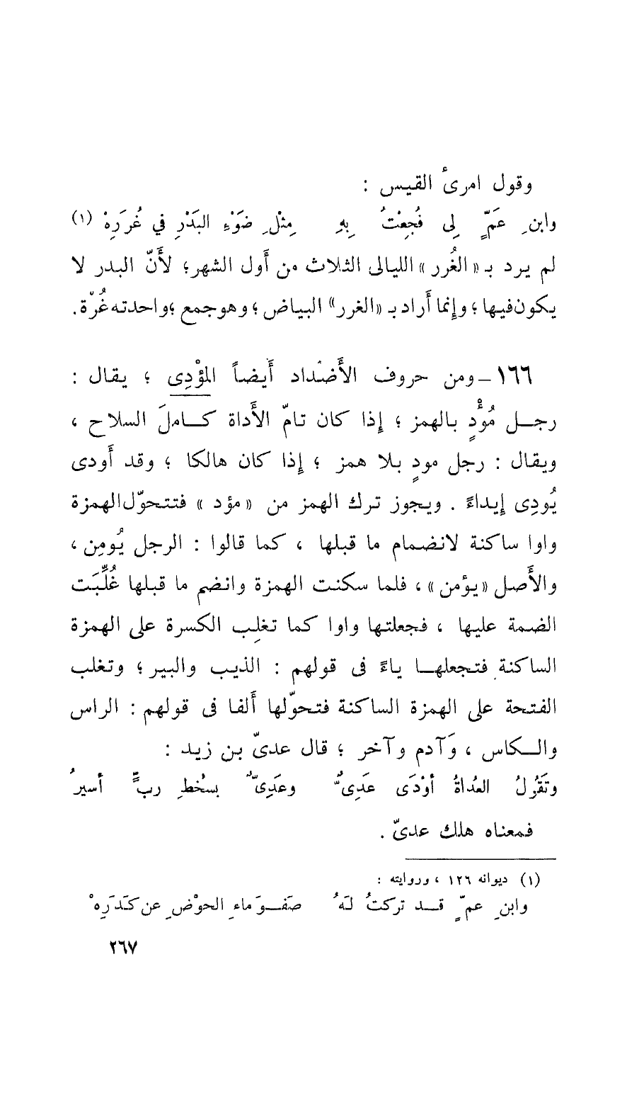 166 - ومن حروف الأَضداد أَيْضاً المؤْدِي؛ يقال: رجل مُؤْدٍ بالهمز؛ إِذا كان تامّ الأَداة كاملَ السلاح، ويقال: رجل مودٍ بلا همز؛ إِذا كان هالكاً؛ وقد أَودَى يُودِي إِيداءً. ويجوز ترك الهمز من مؤد فتتحوَّل الهمزة واو ساكنة لانضمام ما قبلها، كما قالوا: الرَّجُل يُومِن، والأَصل يؤمن، فلمَّا سكنت الهمزة وانضمَّ ما قبلها غُلِّبت الضمَّة عليها، فجعلتها واواً كما تغلِب الكسرة على الهمزة الساكنة فتجعلها ياءً في قولهم: الذيب والبير؛ وتغلب الفتحة على الهمزة الساكنة فتحوِّلها أَلفاً في قولهم: الراس والكاس، وآدم وآخر؛ قال عديّ بن زيد: