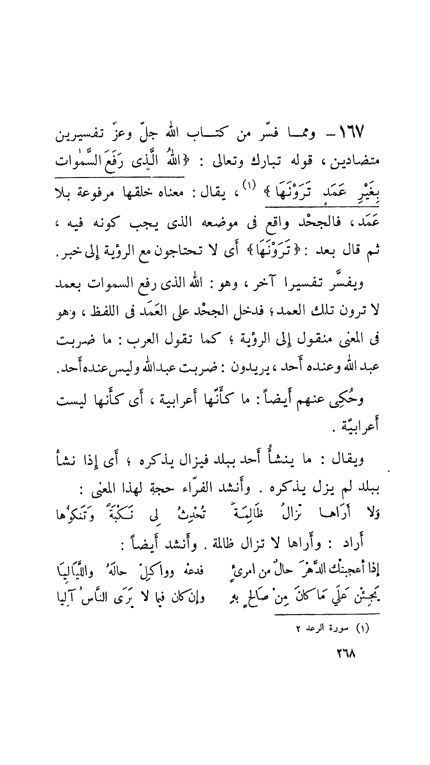 167 - وممَّا فسّر من كتاب الله تفسيرين متضادّين، قوله تبارك وتعالى: اللهُ الَّذي رَفَعَ السَّموات بغَيْرِ عَمَدٍ تَرَوْنَهَا، يقال: معناه خلقها مرفوعة بلا عَمَد، فالجحْد واقع في موضعه الَّذي يجب كونه فيه، ثمَّ قال بعد: تَرَوْنَهَا أَي لا تحتاجون مع الرؤية إِلى خبر.