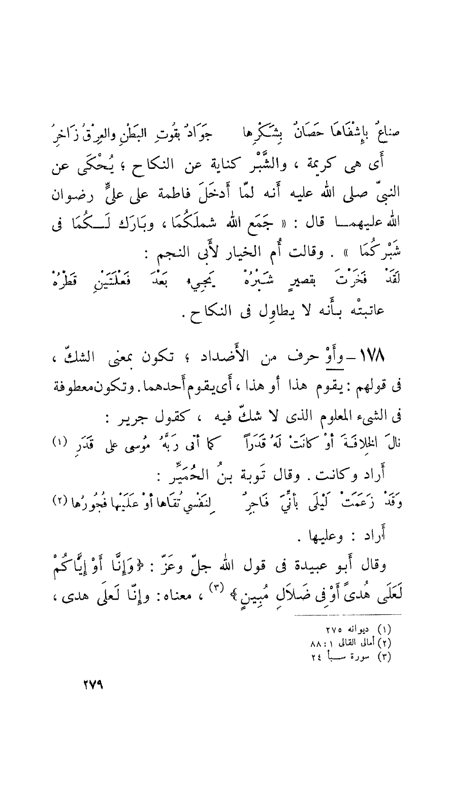 178 - وأوْ حرف من الأَضْداد؛ تكون بمَعْنَى الشكّ، في قولهم: يقوم هذا أَو هذا، أَي يقوم أَحدهما. وتكون معطوفة في الشَّيْء المعلوم الَّذي لا شكَّ فيه، كقول جرير: