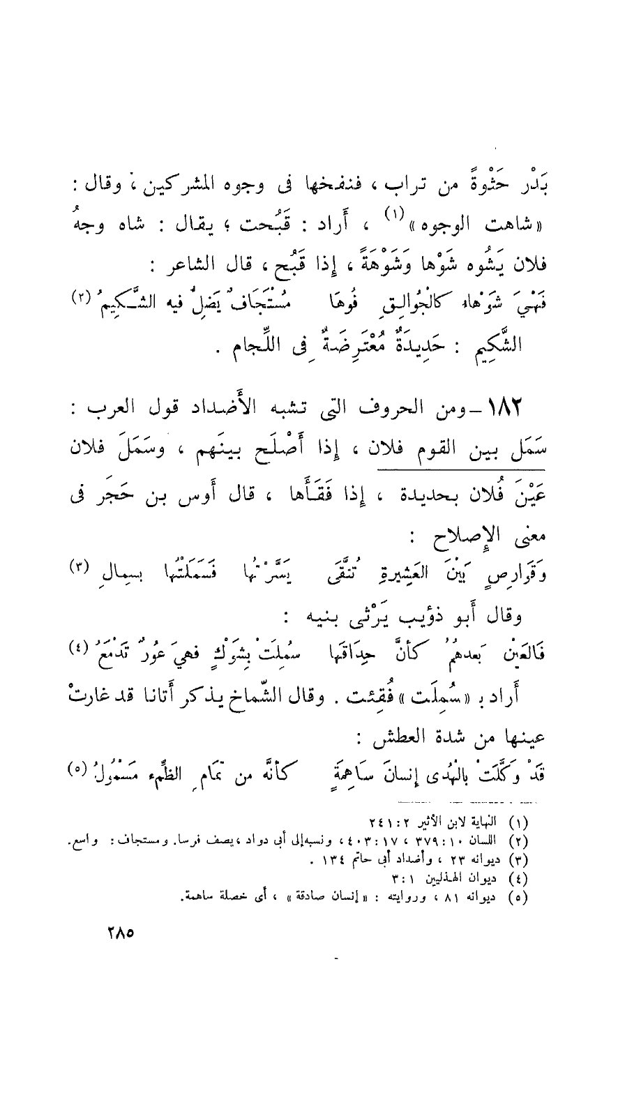 182 - ومن الحروف الَّتي تشبه الأضداد قول العرب: سَمَل بين القوم فلان، إِذا أَصْلَحَ بينهم، وسَمَلَ فلان عَيْنَ فُلان بحديدةٍ، إِذا فَقَأَها، قال أَوس بن حَجَر في معنى الإِصلاح: