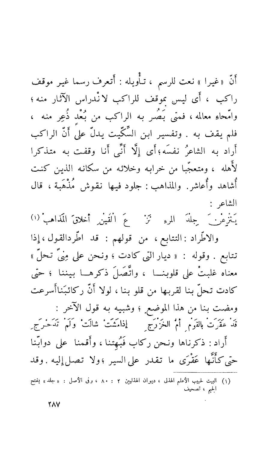 والاطِّراد: التتابع، من قولهم: قد اطَّرد القول، إِذا تتابع. وقوله: ديار الَّتي كادت؛ ونحن على مِنًى تحلّ: معناه غلبتْ على قلوبنا، واتَّصَلَ ذكرها بيننا؛ حتَّى كادت تحلّ بنا لقربها من قلوبنا، لولا أَنَّ ركائبَنا أَسرعت ومضت بنا من هذا الموضع؛ وشبيه به قول الآخر: