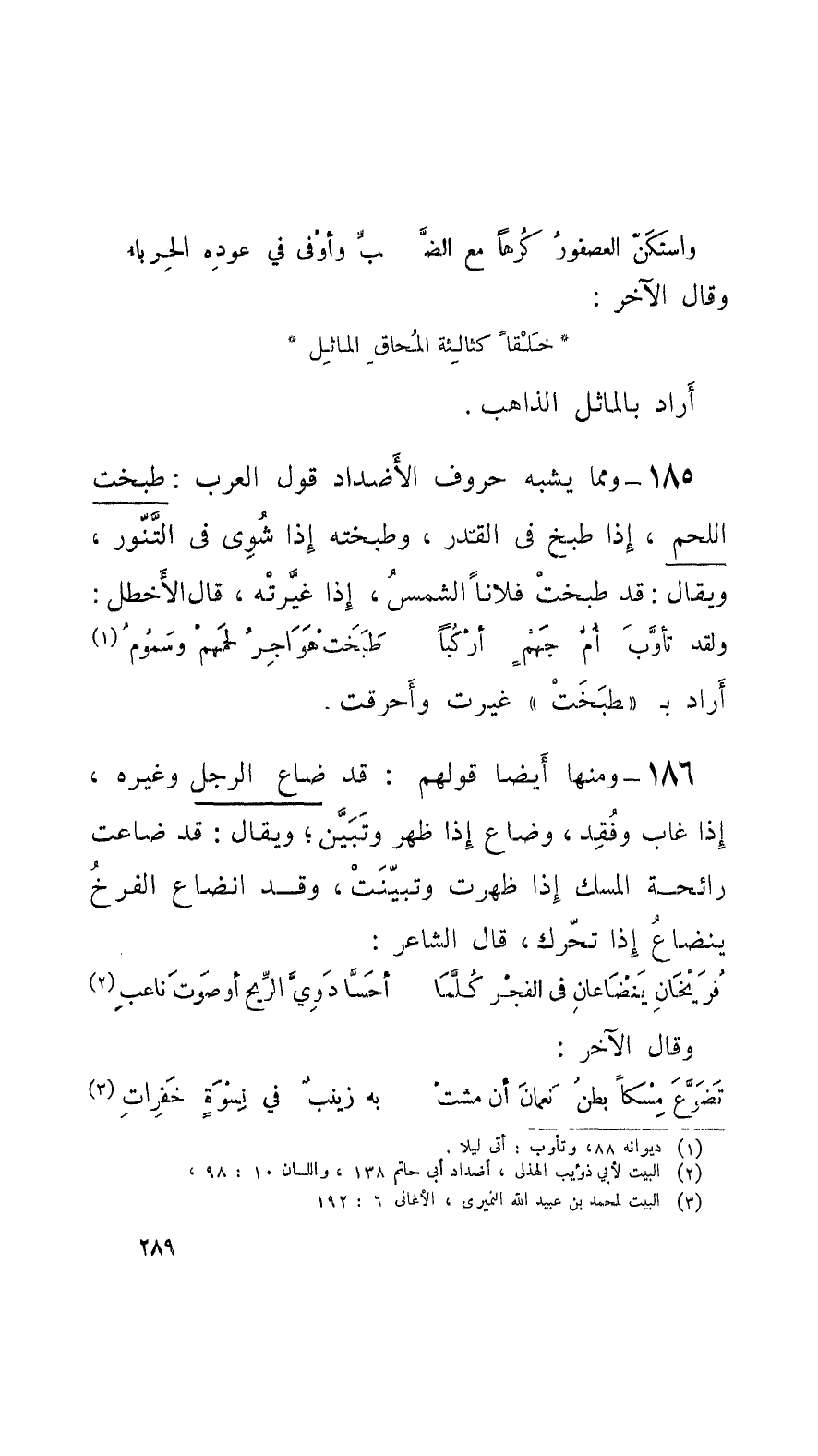 185 - وممَّا يشبه حروف الأَضداد قول العرب: طبخت اللَّحم، إِذا طبخ في القدر، وطبخته إِذا شُوِي في التَّنُّور، ويقال: قد طبختْ فلاناً الشَّمسُ، إِذا غيَّرتْه، قال الأَخطل: