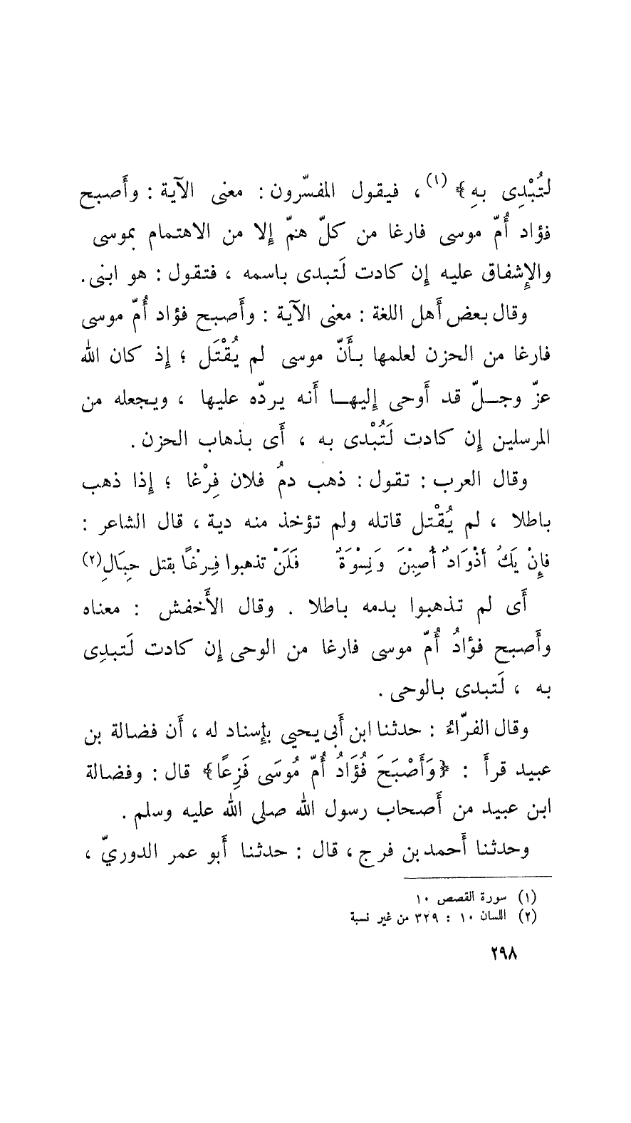 وقالَ بعض أَهل اللُّغة: معنى الآية: وأَصبح فؤاد أُمّ موسى فارغاً من الحزن لعلمها بأنَّ موسى لم يُقْتَل؛ إذْ كان الله عزَ وجلّ قد أَوحى إليها أَنَّهُ يردّه عليها، ويجعله من المرسلين إن كادت لَتُبْدي به، أَي بذهاب الحزن.