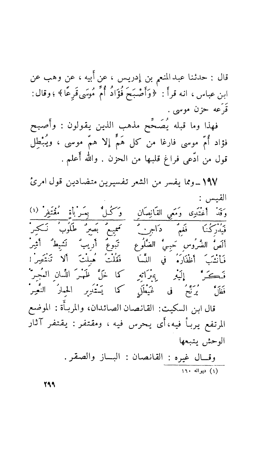 قال: حدَّثنا عبد المنعم بن إدريس، عن أَبيه، عن وهب عن ابن عباس، أَنه قرأَ: وأَصْبَحَ فُؤادُ أُمّ موسى قَرِعاً؛ وقالَ: قَرَعه حزن موسى. فهذا وما قبله يُصَحِّح مذهب الذين يقولون: وأَصبح فؤاد أُمّ موسى فارغاً من كل هَمٍّ إِلاَّ همّ موسى، ويُبْطِل قول من ادّعى فراغ قلبها من الحزن. والله أَعلم.