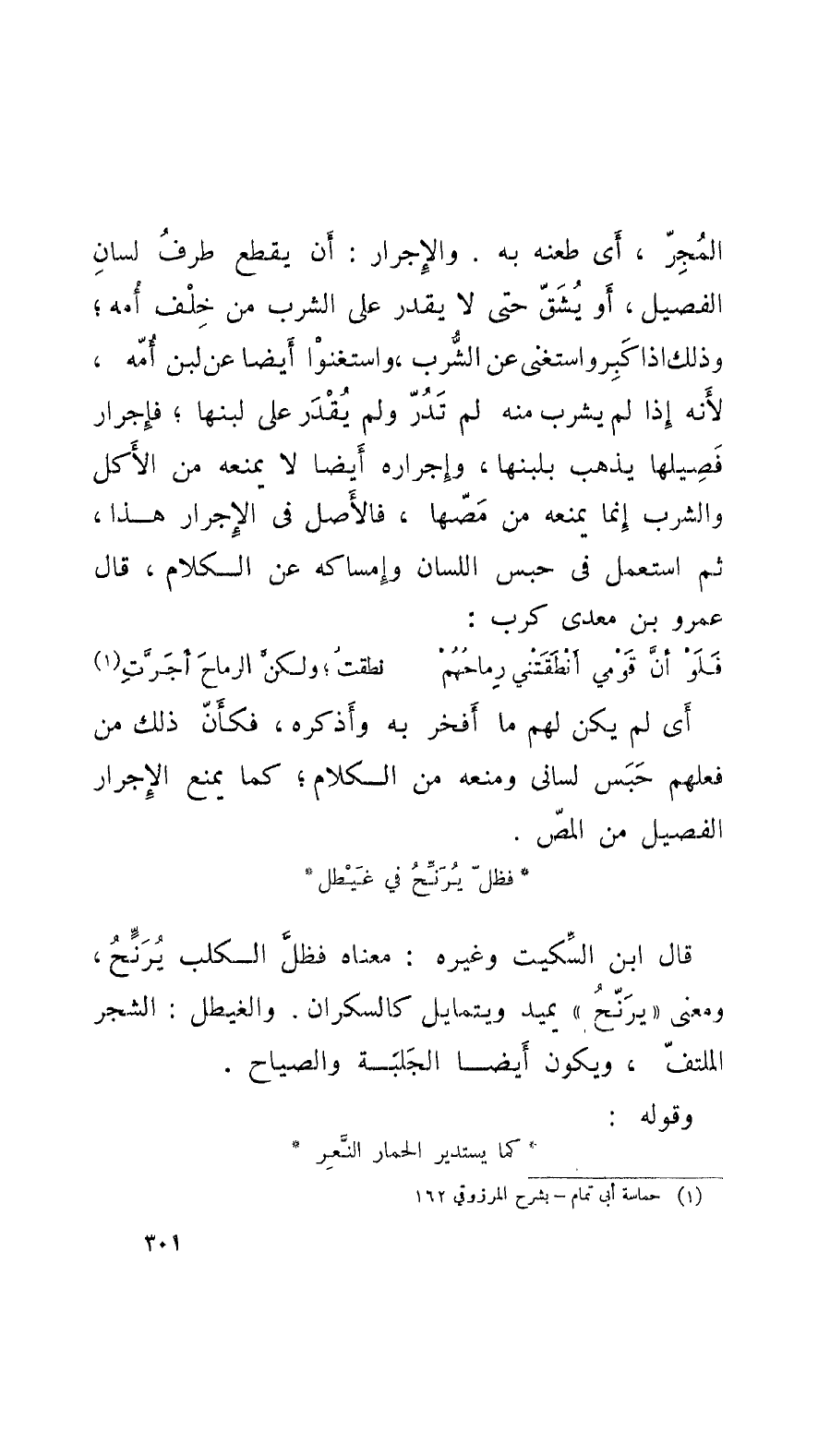 المُجِرّ، أَي طعنه به. والإجرار: أَن يقطع طرفُ لسانِ الفصيل، أَو يُشَقّ حتَّى لا يقدر على الشرب من خَلْف أُمه؛ وذلك إِذا كَبِر واستغنى عن الشُّرب، واستغنوا أَيْضاً عن لبن أُمّه، لأَنَّه إِذا لم يشرب منه لم تَدُرّ ولم يُقْدَر على لبنها؛ فإجرار فَصيلها يذهب بلبنها، وإجراره أَيْضاً لا يمنعه من الأَكل والشرب إنما يمنعه من مَصّها، فالأَصل في الإجرار هذا، ثمَّ استعمل في حبس اللّسَان وإمساكه عن الكلام، قال عمرو بن معدي كرب: