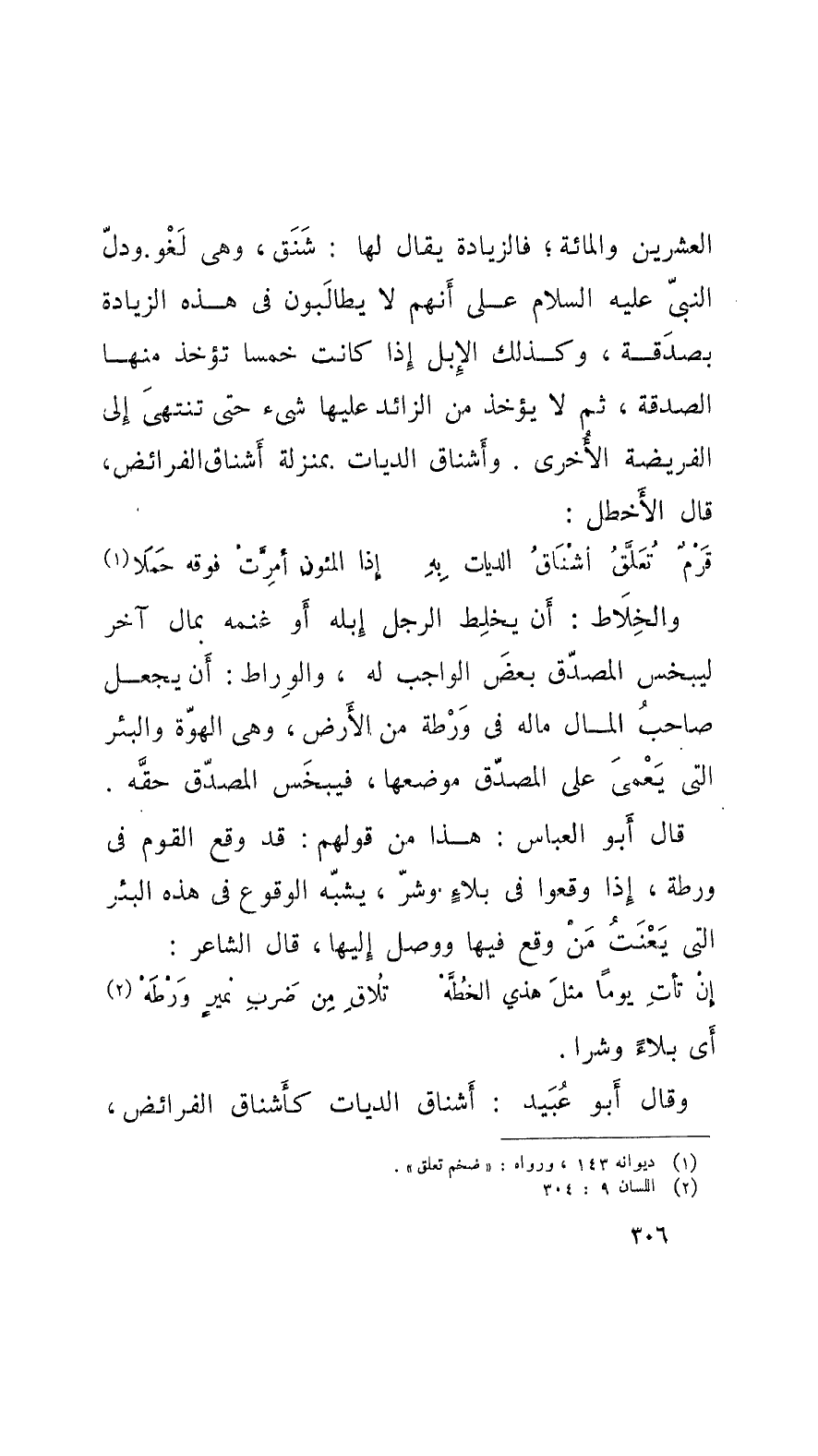 العشرين والمائة؛ فالزيادة يقال لها: شَنَق، وهي لَغْو. ودلّ النَّبِيّ عليه السلام على أنهم لا يطالَبون في هذه الزيادة بصدَقة، وكذلك الإِبِل إِذا كانت خمساً تؤخذ منها الصدقة، ثمَّ لا يؤخذ من الزائد عليها شيء حتَّى تنتهيَ إِلى الفريضة الأُخرى. وأَشناق الديات بمنزلة أَشناق الفرائض، قال الأَخطل: