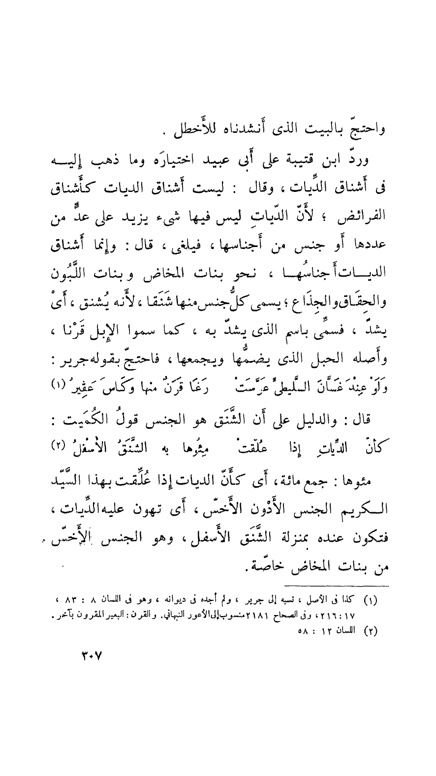 واحتجّ بالبيت الَّذي أَنشدناه للأخطل. وردّ ابن قتيبة على أَبي عُبيد اختيارَه وما ذهب إليه في أَشناق الدِّيات، وقالَ: لَيْسَتْ أَشناق الديات كأَشناق الفرائض؛ لأَنَّ الدّياتِ لَيْسَ فيها شيء يزيد على عدٍّ من عددها أَو جنس من أَجناسها، فيلغى، قال: وإنما أَشناق الديات أَجناسُها، نحو بنات المخاض وبنات اللَّبون والحِقاق والجِذاع؛ يُسَمَّى كلُّ جنس منها شَنَقاً، لأَنَّه يُشنق، أَي يشدّ، فسمِّي باسم الَّذي يشدّ به، كما سموا الإِبِل قَرْناً، وأَصله الحبل الَّذي يضمُّها ويجمعها، فاحتجّ بقوله جرير: