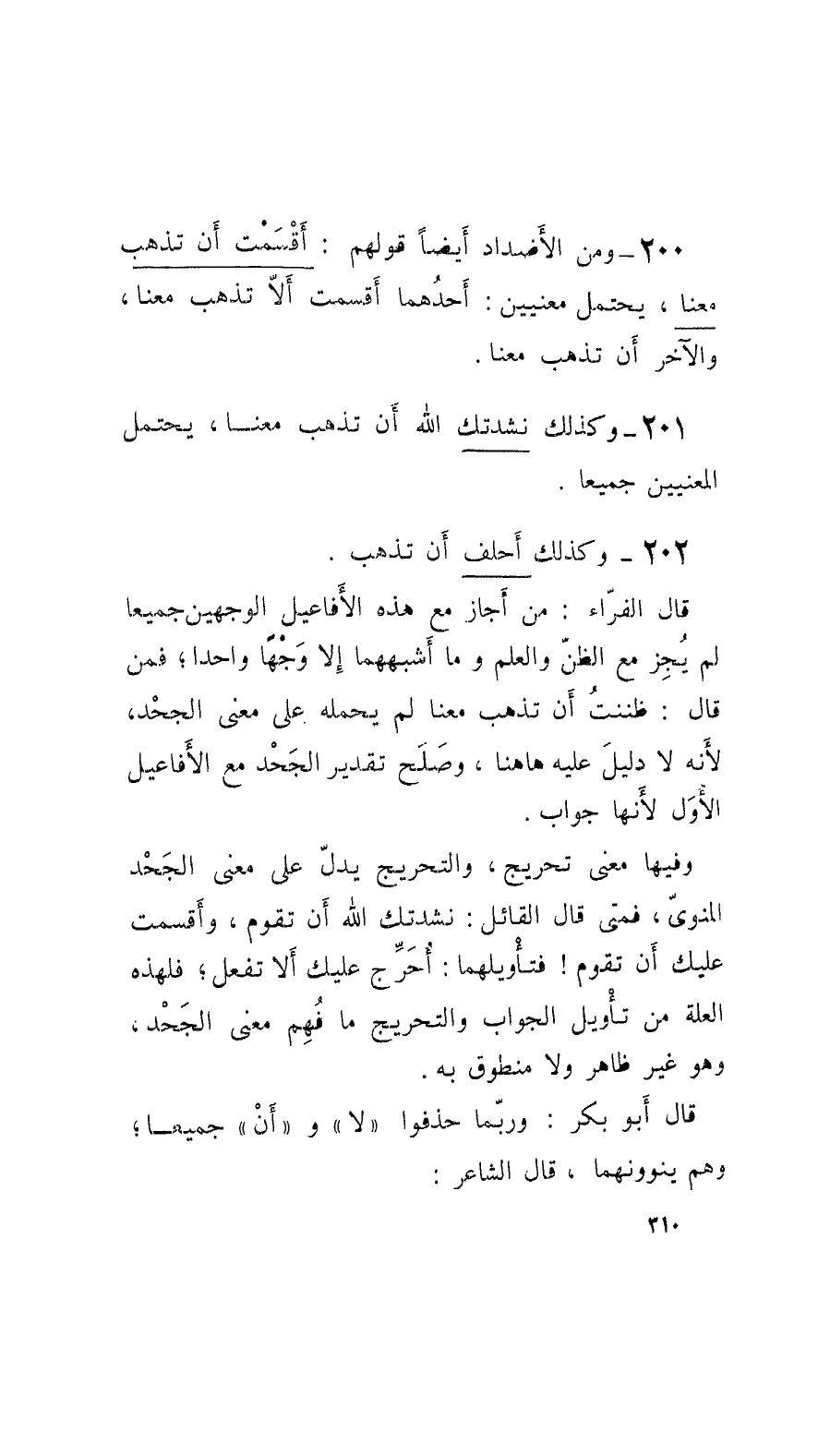 200 - ومن الأَضداد أَيْضاً قولهم: أَقْسَمْت أَن تذهب معنا، يحتمل معنيين: أَحدُهما أَقسمت أَلاَّ تذهب معنا، والآخر أَن تذهب معنا.