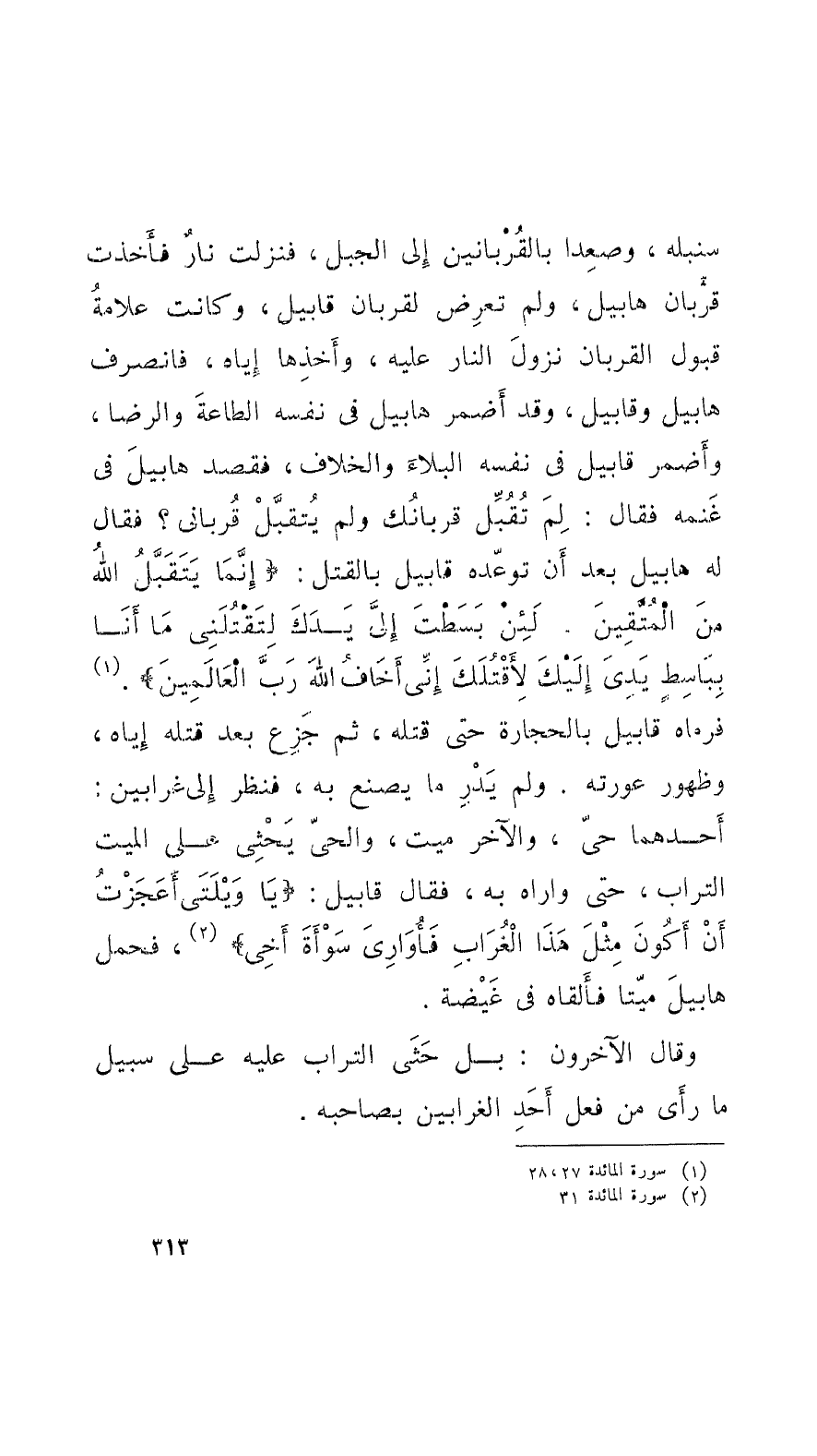 نزولَ النار عليه، وأَخذِها إياه، فانصرف هابيل وقابيل، وقد أَضمر هابيل في نفسه الطاعةَ والرضا، وأَضمر قابيل في نفسه البلاءَ والخلاف، فقصد هابيلَ في غَنمه فقال: لِمَ تُقُبِّل قربانك ولم يُتقبَّلْ قُرباني؟ فقال له هابيل بعد أَن توعّده قابيل بالقتل: إنَّما يَتَقَبَّلُ الله منَ المُتَّقينَ، لَئِنْ بَسَطْتَ إليَّ يَدَكَ لِتَقْتُلَني ما أَنا بِباسِطٍ يَدِيَ لأَقْتُلَكَ إنِّي أَخافُ الله رَبِّ العالَمين. فرماه قابيل بالحجارة حتى قتله، ثمَّ جَزِعَ بعد قتله إياه، وظهور عورته. ولم يَدْرِ ما يصنع به، فنظر إِلى غرابين: أَحدهما حيّ، والآخر ميت، والحيّ يَحْثي على الميت التراب، حتَّى واراه به، فقال قابيل: يا وَيْلَتَي أَعَجَزْتُ أَنْ أَكونَ مِثْلَ هذا الغُرابِ فَأُواريَ سَوْأَةَ أَخي، فحمل هابيلَ ميْتاً فأَلقاه في غَيْضة.