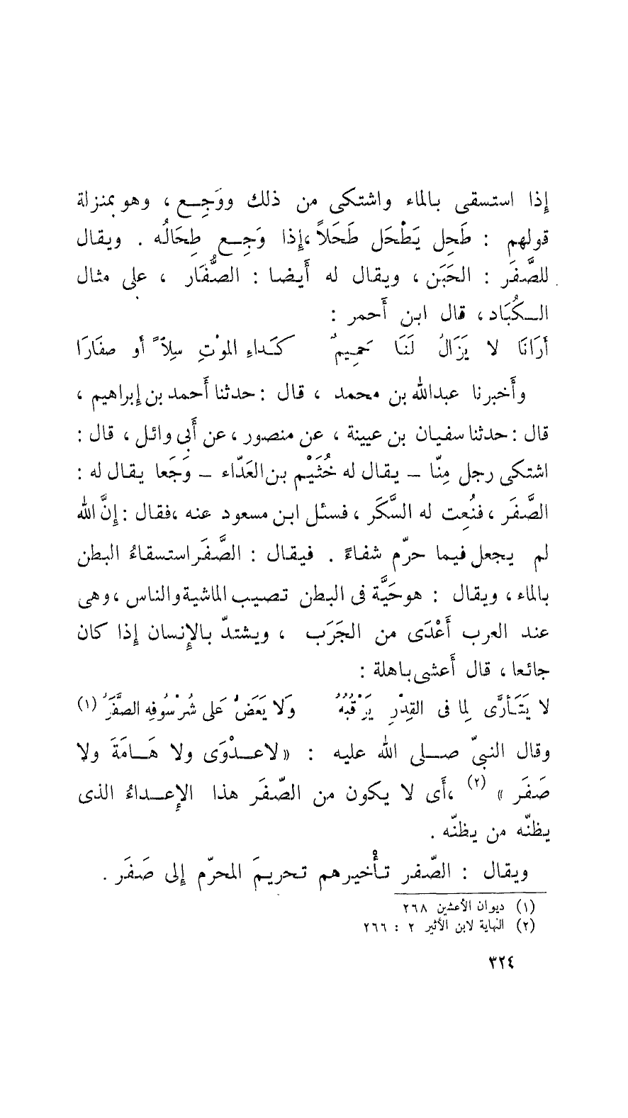 وأَخبرنا عبد الله بن محمد، قال: حدَّثنا أَحمد بن إِبراهيم، قال: حدَّثنا سفيان بن عُيينة، عن منصور، عن أَبي وائل، قال: اشتكى رجلٌ منَّا - يقال له خُثَيْم بن العَدَّاء - وجَعاً يقال له: الصَّفَر، فنُعِت له السَّكَر، فسئل ابن مسعود عنه، فقال: إِنَّ الله لم يجعل فيما حرَّم شفاءً. فيقال: الصَّفَر استسقاء البطن بالماء، ويقال: هو حَيَّة في البطن تصيب الماشية والناس، وهي عند العرب أَعْدَى من الجَرَب، ويشتدّ بالإِنسان إِذا كان جائعاً، قال أَعشى باهلة: