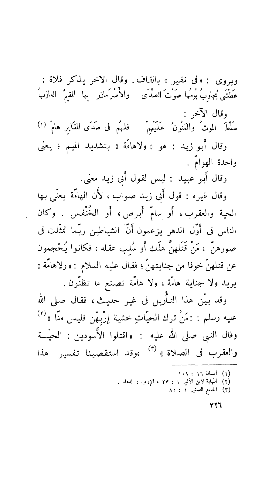 وقالَ غيرُه: قول أَبي زيد صواب، لأَنَّ الهامَّة يعني بها الحيَّة والعقرب، أَو سامّ أَبرص، أَو الخُنْفس. وكانَ النَّاس في أَوَّل الدهر يزعمون أنَّ الشَّياطين ربَّما تمثَّلت في صورهنّ، مَنْ قَتَلَهنّ هلَك أَو سُلِب عقله، فكانوا يُحْجمون عن قتلهنّ خوفاً من جنايتهنّ؛ فقال عليه السَّلام: ولا هامَّة يريد ولا جناية هامَّة، ولا هامَّة تصنع ما تظنُّون.