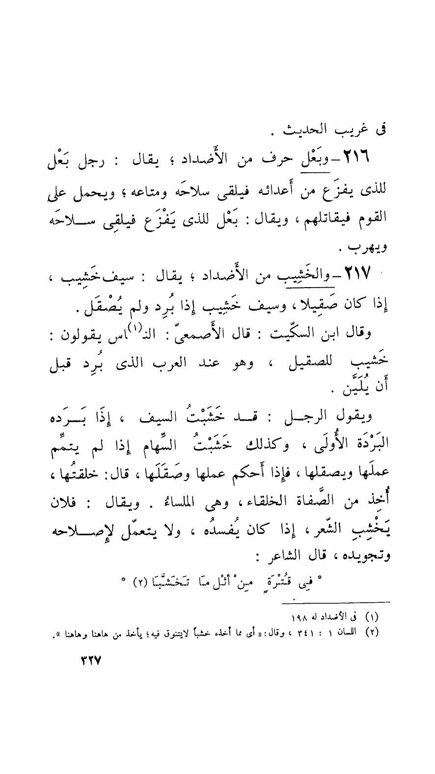217 - والخَشِيب من الأَضداد؛ يقال: سيف خَشِيب، إِذا كان صَقِيلاً، وسيف خَشِيب إِذا بُرِد ولم يُصْقَل.