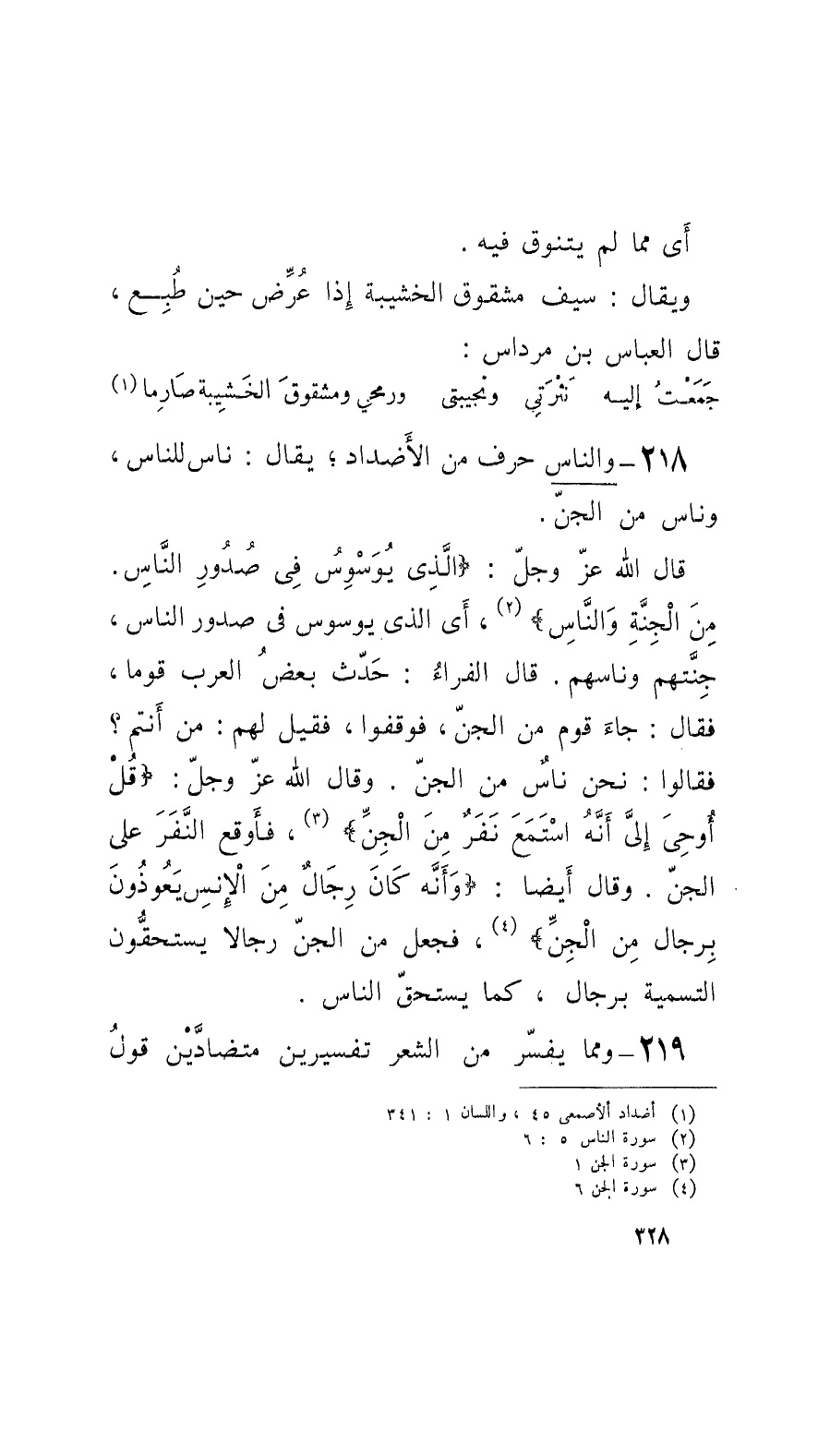 218 - والنَّاس حرف من الأَضْداد؛ يقال: ناس للناس، وناس من الجنّ.