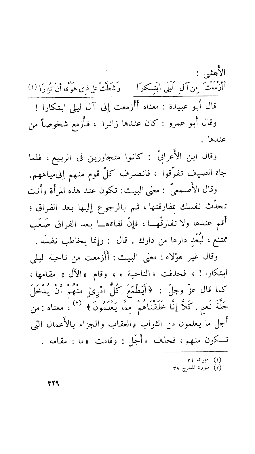 وقالَ غير هؤلاء: معنى البيت: أَأَزمعت من ناحية لَيْلَى ابتكاراً! فحذفت الناحية، وقام الآل مقامها، كما قال عزَ وجلّ: أَيَطْمَعُ كُلُّ امْرِئٍ منْهُمْ أَنْ يُدْخَلَ جَنَّةَ نَعِيم. كلاَّ إِنَّا خَلَقْنَاهُمْ مِمَّا يَعْلَمُونَ، معناه: من أَجل ما يعلمون من الثواب والعقاب والجزاء بالأَعمال الَّتي تكون منهم، فحذف أَجْل وقامت ما مقامه.