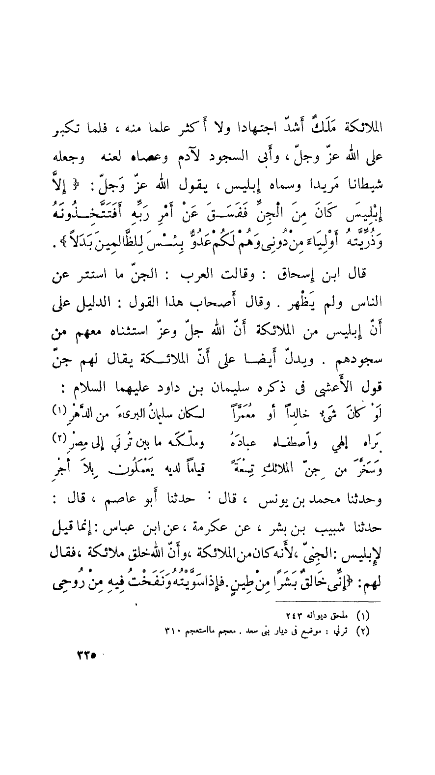 وحدَّثنا محمد بن يونس، قال: حدَّثنا أَبو عاصم، قال: حدَّثنا شبيب بن بشر، عن عكرمة، عن ابن عباس، قال: إنَّما قيل لإِبليس: الجِنيّ، لأَنَّه كان من الملائكة، وأَنَّ الله خلق ملائكة، فقال لهم: إِنِّي خَالقٌ بَشَراً مِنْ طِينٍ. فإِذا سَوَّيْتُهُ ونَفَخْتُ فِيهِ مِنْ رُوحِي