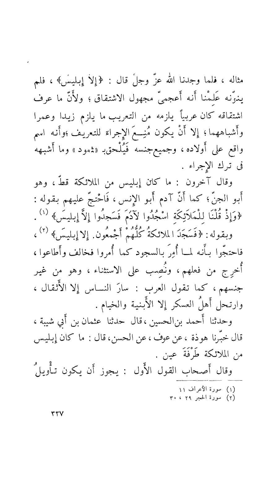 وحدَّثنا أَحمد بن الحسين، قال: حدَّثنا عثمان بن أَبي شيبة، قال: خبَّرنا هوذة، عن عوف، عن الحسن، قال: ما كان إِبليس من الملائكة طَرْفَةَ عين.