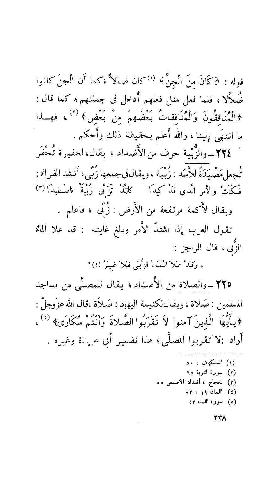 225 - والصَّلاة من الأَضداد؛ يقال للمصلَّى من مساجد المسلمين: صَلاة، ويقال لكنيسة اليهود: صَلاَة، قال الله عزَ وجلّ: يأَيُّهَا الَّذينَ آمنوا لاَ تَقْرَبُوا الصَّلاةَ وأَنْتُمْ