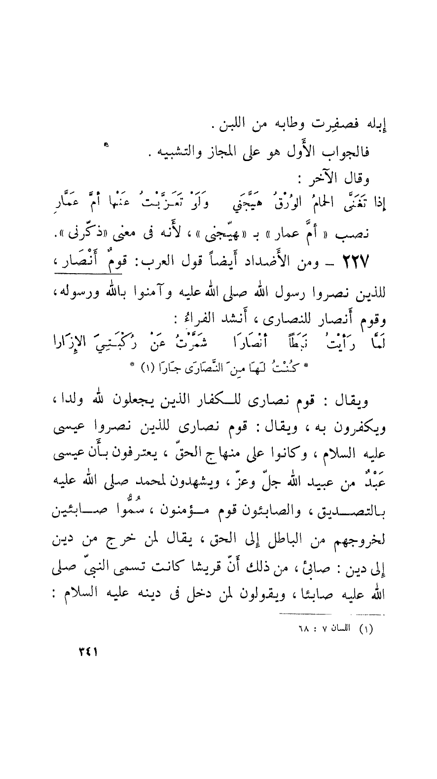 227 - ومن الأَضْداد أَيْضاً قول العرب: قومٌ أَنْصارٌ، للذَّين نصروا رسول الله صلّى الله عليه وسلَّم وآمنوا بالله ورسوله، وقوم أَنصار للنصارى، أنشد الفرَّاءُ: