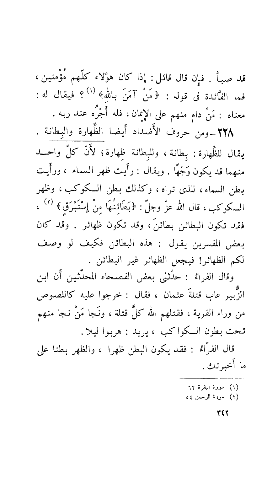 228 - ومن حروف الأَضْداد أَيْضاً الظِّهارة والبِطانة. يقال للظِّهارة: بِطانة، وللبِطانة ظِهارة؛ لأنَّ كلّ واحد منهما قد يكون وَجْهاً. ويقال: رأَيت ظهر السَّماء، ورأَيت بطن السَّماء، للَّذي تراه، وكذلك بطن الكوكب، وظهر الكوكب، قالَ الله عزَّ