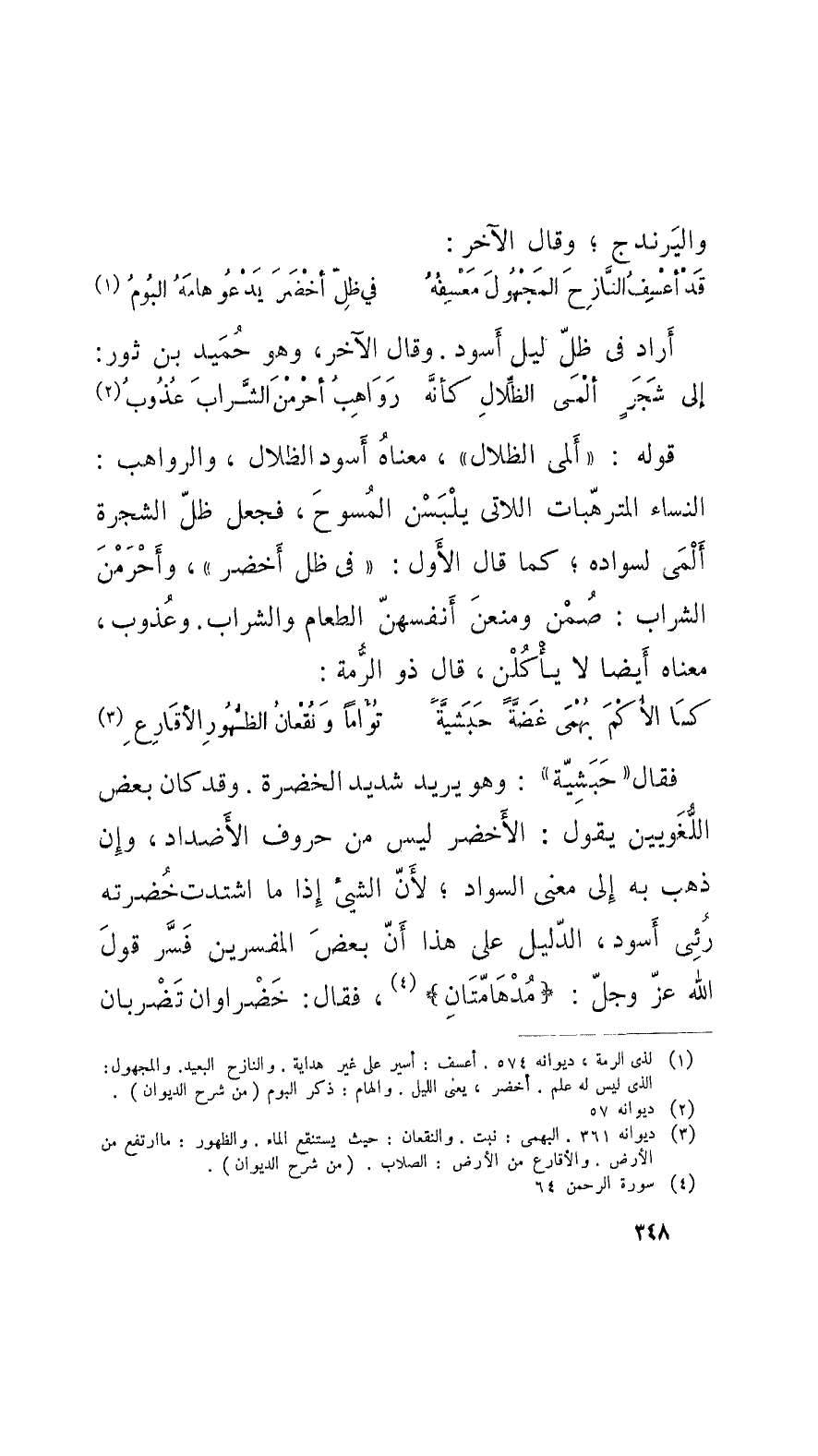 فقال حَبَشِيَّة: وهو يريد شديد الخضرة. وقد كان بعض اللُّغَويِّين يقول: الأَخضر ليس من حروف الأَضْداد، وإِن ذهب به إِلى معنى السَّواد؛ لأنَّ الشَّيء إِذا ما اشتدَّت خُضْرته رُئِي أَسود، الدَّليل على هذا أَنَّ بعض المفسرِّين فَسَّر قولَ الله عزَّ وجلَّ: مُدْهَامَّتَانِ، فقال: خَضْراوان تَضْربان