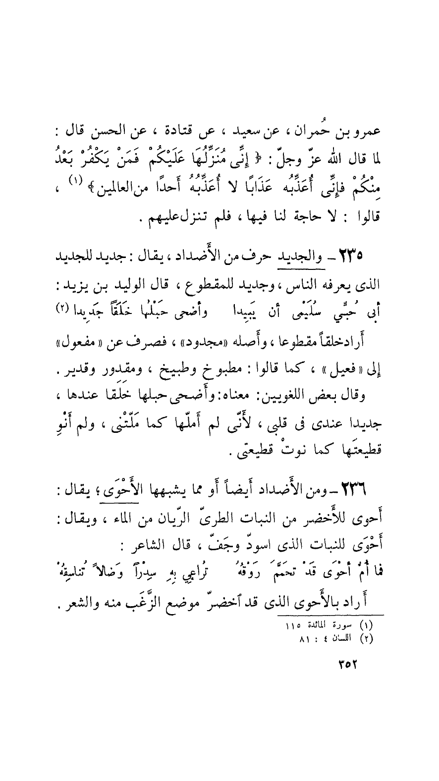 236 - ومن الأَضْداد أَيْضاً أَو ممَّا يشبهها الأَحْوَى؛ يقال: أَحْوَى للأَخضر من النَّبات الطريّ الرَّيَّان من الماء، ويقال: أَحْوَى للنَّبات الَّذي اسودَّ وجَفَّ، قالَ الشَّاعر: