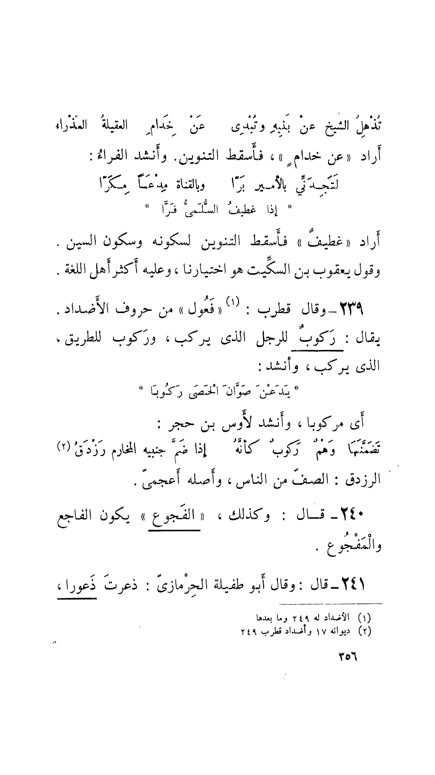 239 - وقال قُطْرب: فَعُول من حروف الأَضْداد. يُقال: رَكوبٌ للرَّجل الَّذي يركب، ورَكوب للطَّريق، الَّذي يركب، وأَنشَدَ: