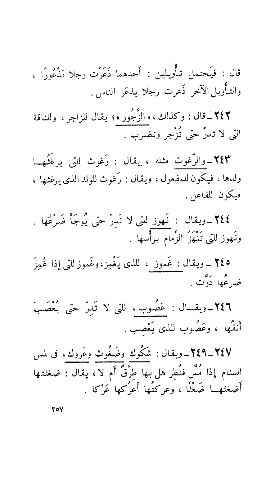 242 - قال: وكذلك الزَّجُور؛ يُقال للزاجر، وللنَّاقة الَّتي لا تدرّ حتَّى تُزْجر وتُضرب.