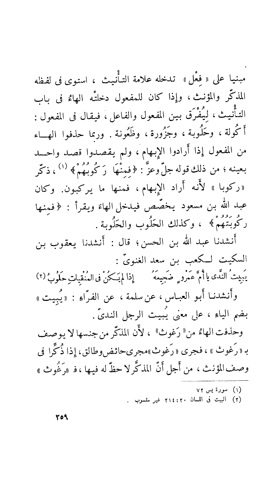 مبنيًّا على فِعْل تدخله علامة التأْنيث، استوى في لفظه المذكَّر والمؤنَّث، وإِذا كان للمفعول دخلتْه الهاءُ في باب التأْنيث، لِيُفْرَقُ بين المفعول والفاعل، فيقال في المفعول: أَكُولة، وحُلوبة، وجَزُورة، وظَعُونة. وربَّما حذفوا الهاءَ من المفعول إِذا أَرادوا الإِبهام، ولم يقصدوا قصد واحد بعينه؛ من ذلك قوله عزّ وجلّ: فمِنْها رَكُوبُهُمْ، ذكر رَكوبا لأَنَّه أَراد الإِبهام، فمنها ما يركبون. وكان عبد الله بن مسعود يخصّص فيدخل الهاءَ ويقرأْ: فمِنْها رَكُوبَتُهُمْ، وكذلك الحَلُوب والحَلُوبة. أَنشدنا عبد الله بن الحسن، قال: أَنشدنا يعقوب بن السِّكِّيت لكعب بن سعد الغنويّ: