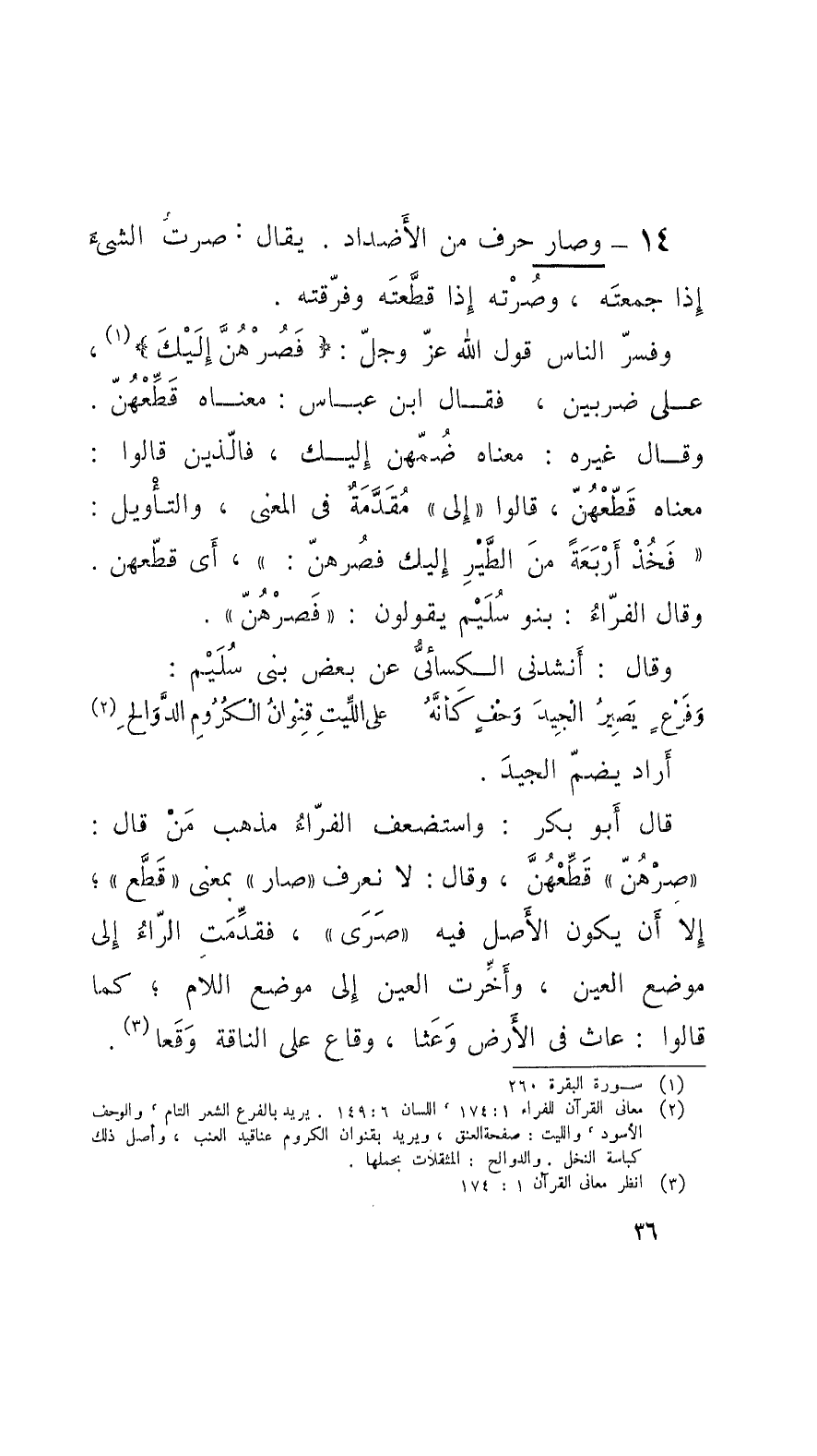 14 - وصار حرف من الأَضْداد. يقال: صرتُ الشَّيْءَ إِذا جمعتَه، وصُرْته إِذا قطَّعتَه وفرَّقته. وفسَّر النَّاسُ قول الله عزَ وجلّ: فَصُرْهُنَّ إِلَيْكَ، على ضربين، فقال ابن عبَّاس: معناه قَطِّعْهُنَّ. وقالَ غيره: معناه ضُمَّهنَّ إِليك، فالَّذين قالوا: معناه قَطِّعْهُنَّ، قالوا: إِلى مُقَدَّمَةٌ في المعنى، والتَّأْويل: فَخُذْ أَرْبَعَةً منَ الطَّيْرِ إِليك فصُرهنَّ، أَي قطّعهنّ. وقالَ الفرَّاء: بنو سُلَيْم يقولون: فَصِرْهُنَّ. وقالَ: أَنشدني الكِسَائِيّ عن بعض بَنِي سُلَيْم: