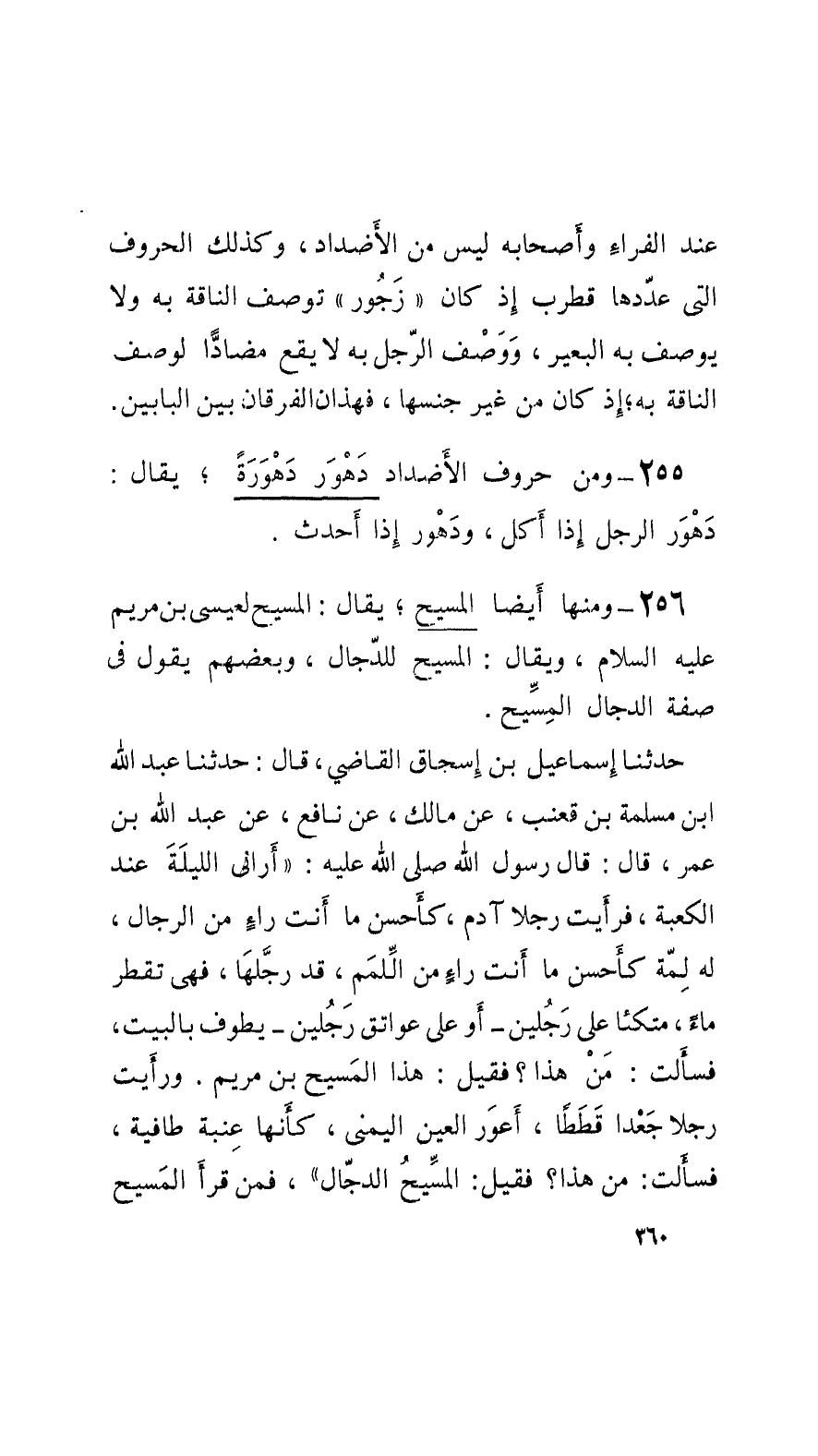256 - ومنها أَيْضاً المسيح؛ يُقال: المسيح لعيسى بن مريم عليه السَّلام، ويُقال: المسيح للدَّجَّال، وبعضهم يقول في صفة الدَّجَّال المِسِّيح.