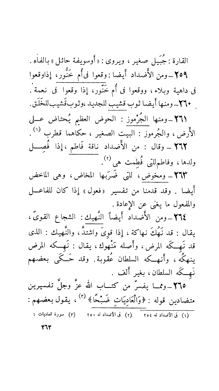 264 - ومن الأَضْداد أَيْضاً النَّهيك: الشّجاع القويّ، يُقال: قد نَهُكَ نهاكة، إِذا قوِيَ واشتدَّ، والنَّهيك: الَّذي قد نَهِكَه المرض، وأَصله مَنْهوك، يُقال: نَهِكَه المرض ينهكُه، وأَنهكه السُّلطان عُقوبة. وقد بعضهم نَهِكَه السُّلطان بغير أَلف.
