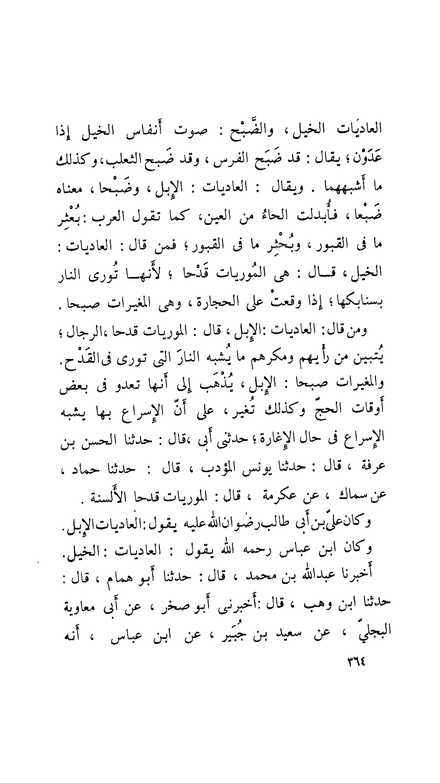 حدَّثني أَبي، قال: حدَّثنا الحسن بن عرفة، قال: حدَّثنا يونس المؤدب، قال: حدَّثنا حماد، عن سماك، عن عكرمة، قال: الموريات قدحا الأَلسنة. وكان عليّ بن أَبي طالب رضوان الله عليه يقول: العاديات: الإِبل. وكان ابن عباس رحمه الله يقول: العاديات: الخيل.