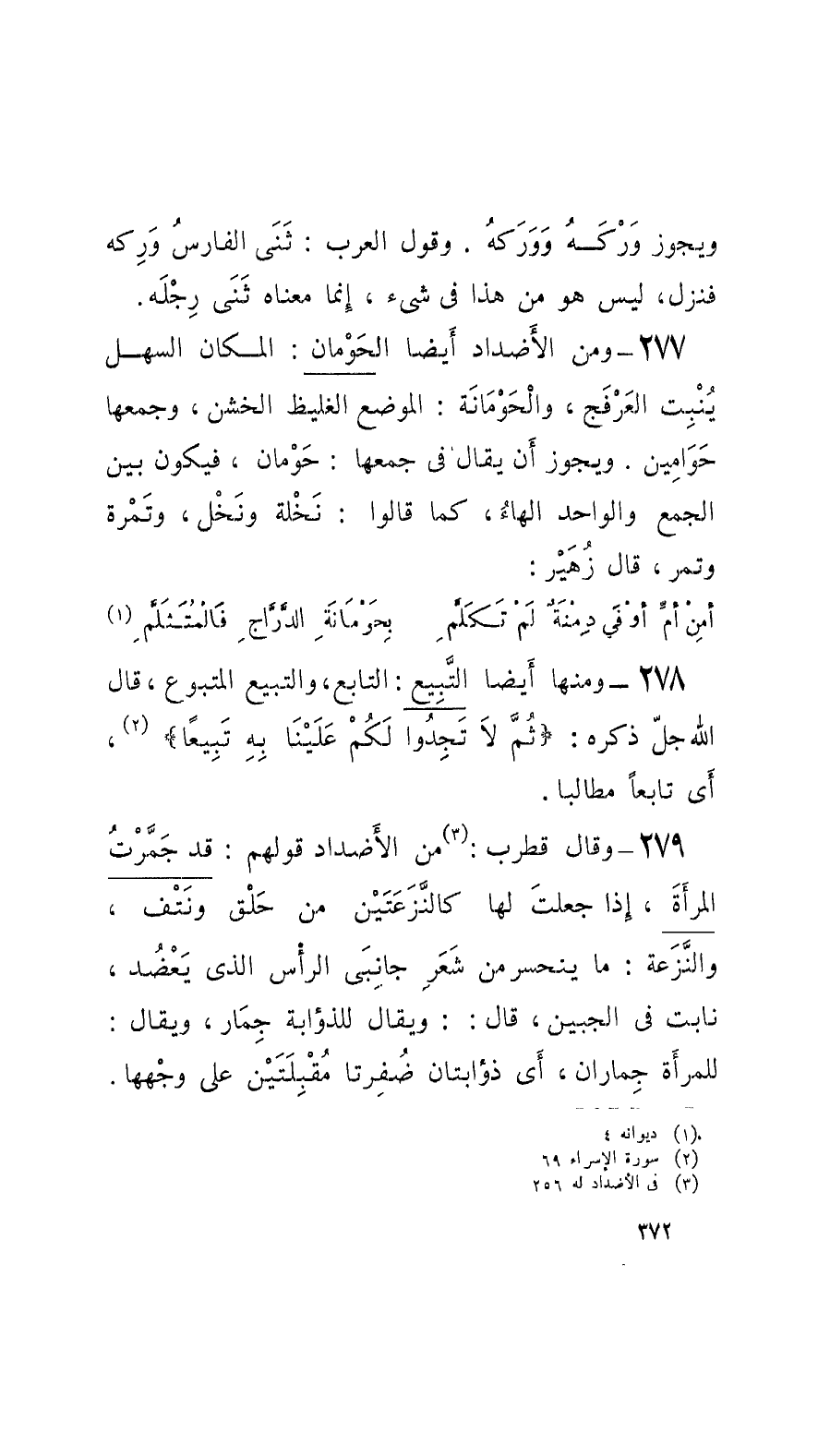 277 - ومن الأضداد أَيضاً الحَوْمان: المكان السهل يُنْبِت العَرْفَج، والحَوْمَانَة: الموضع الغليظ الخشن، وجمعها حَوَامِين. ويجوز أَن يقال في جمعها: حَوْمان، فيكون بين الجمع والواحد الهاءُ، كما قالوا: نَخْلة ونَخْل، وتَمْرة وتمر، قال زُهَير: