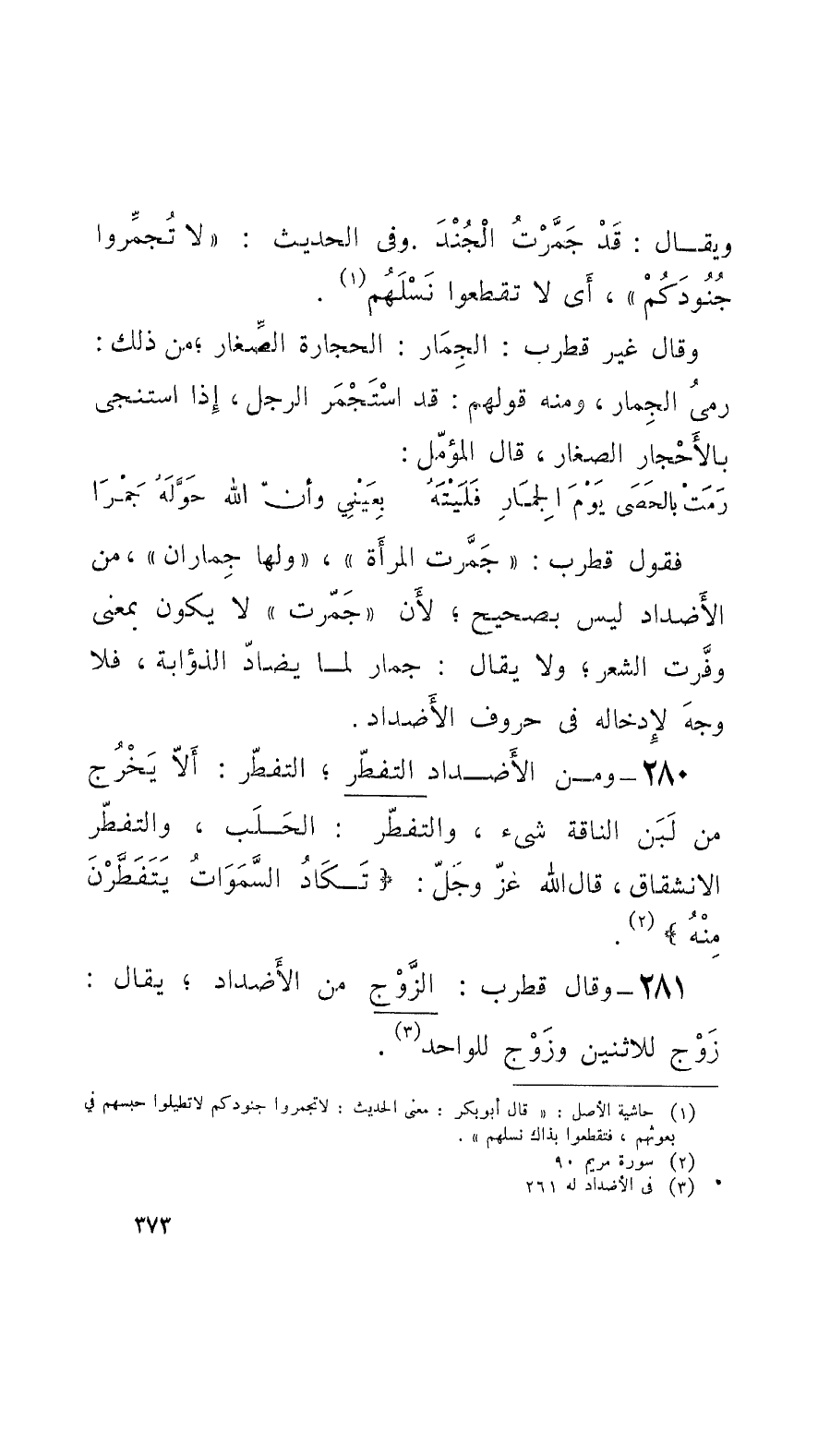 281 - وقال قُطْرب: الزَّوج من الأضدادِ؛ يُقال: زَوْج للاثنين وزَوْج للواحد.