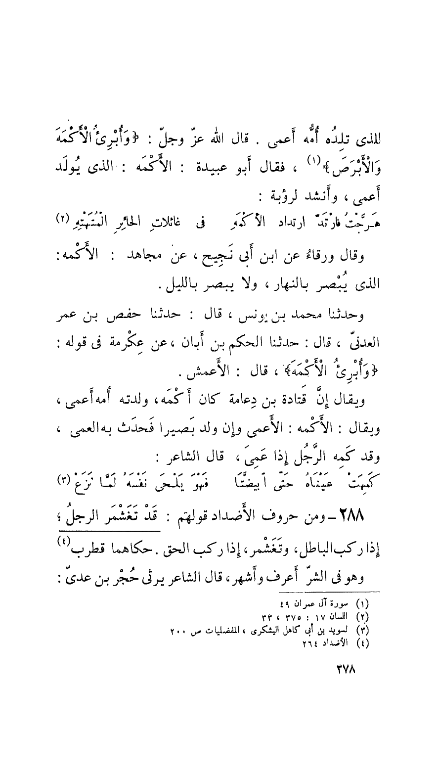 288 - ومن حروف الأَضْداد قولهم: قَدْ تَغَشْمَرَ الرَّجُلُ؛ إِذا ركب بالباطل، وتَغَشْمَرَ، إِذا ركب الحقّ. حكاهما قُطْرب وهو في الشرّ أَعرف وأَشهر، قال الشَّاعر يرثي حُجْر بن عديّ: