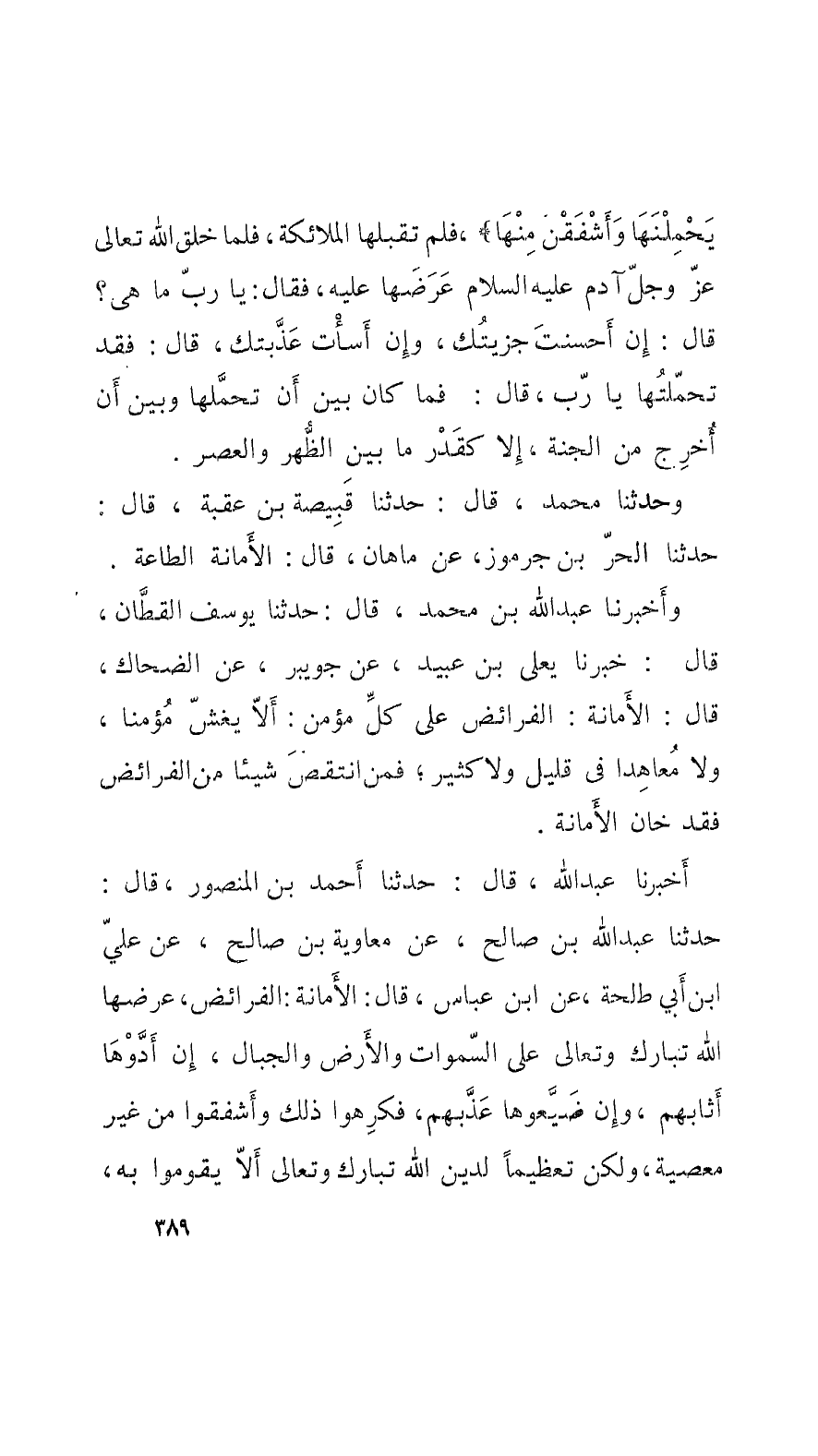 وأَخبرنا عبد الله بن محمد، قال: حدَّثنا يوسف القطَّان، قال: خبرنا يعلى بن عبيد، عن جويبر، عن الضَّحَّاك، قال: الأَمانة: الفرائض على كلِّ مؤمن: أَلاَّ يغشّ مُؤمناً، ولا مُعاهِداً في قليل ولا كثير؛ فمن انتقصَ شيئاً من الفرائض فقد خان الأَمانة. أَخبرنا عبد الله، قال: حدَّثنا أَحمد بن المنصور، قال: حدَّثنا عبد الله بن صالح، عن معاوية بن صالح، عن عليّ ابن أَبي طلحة، عن ابن عباس، قال: الأَمانة: الفرائض، عرضها الله تبارك وتعالى على السَّموات والأَرض والجبال، إِن أَدُّوها أَثابهم، وإِن ضيَّعوها عَذَّبهم، فكرهوا ذلك وأَشفقوا من غير معصية، ولكن تعظيماً لدين الله تبارك وتعالى أَلاَّ يقوموا به،