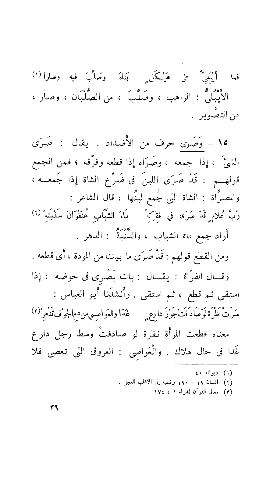 15 - وصَرَى حرف من الأَضْداد. يقال: صَرَى الشَّيْءَ، إِذا جمعه، وصَرَاه إِذا قطعه وفرَّقه؛ فمن الجمع قولهم: قدْ صَرَى اللَّبَنَ في ضَرْعِ الشَّاة إِذا جَمعه، والمصرَّاة: الشَّاة التي جُمع لبنُها، قال الشَّاعر: