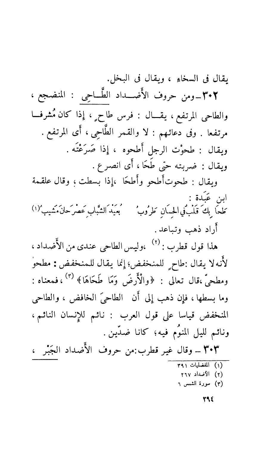 302 - ومن حروف الأَضداد الطَّاحِي: المنضجع، والطَّاحي المرتفع، يُقال: فرس طاحٍ، إِذا كان مُشرفاً مرتفعاً، وفي دعائهم: لا والقمر الطَّاحي، أَي المرتفع.