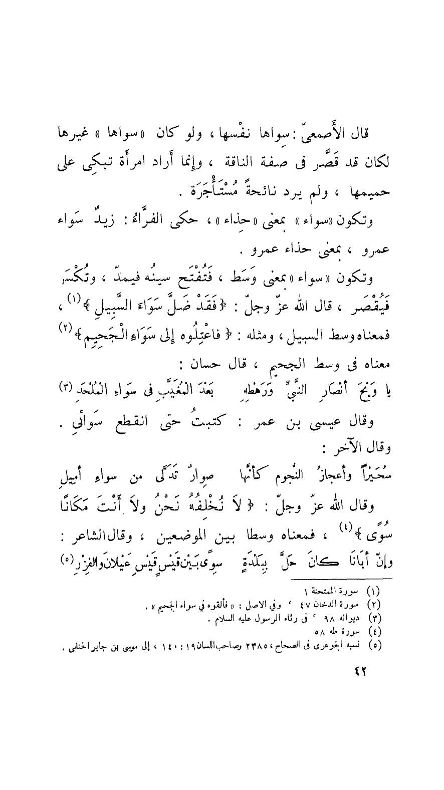 وتكون سواء بمَعْنَى حِذاء، حكى الفَرَّاءُ: زيدٌ سَواء عَمْرو، بمَعْنَى حذاء عَمْرو. وتكون سواء بمَعْنَى وَسَط، فتُفْتَحُ سِينُه فيمدّ، وتُكْسَر فيُقْصَر، قال الله عزَ وجلّ: فَقَدْ ضَلَّ سَوَاءَ السَّبِيلِ، فمعناه وسط السَّبيل، ومثله: فاعْتِلُوه إِلى سَوَاءِ الجَحِيمِ معناه في وسط الجحيم، قال حسَّان: