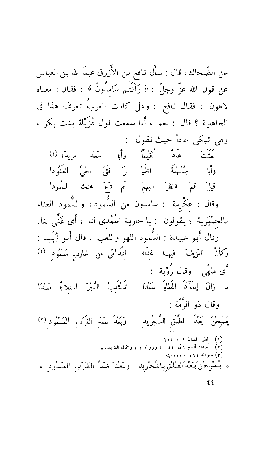 عن الضّحّاك، قال: سأَل نافع بن الأَزرق عبد الله بن العبَّاس عن قول الله عزَ وجلّ: وأَنْتُمْ سَامِدُونَ، فقال: معناه لاهون، فقال نافع: وهل كانت العربُ تعرف هذا في الجاهليَّة؟ قال: نعم، أَما سمعت قول هُزَيْلة بنت بكر، وهي تبكي عاداً حيث تقول: