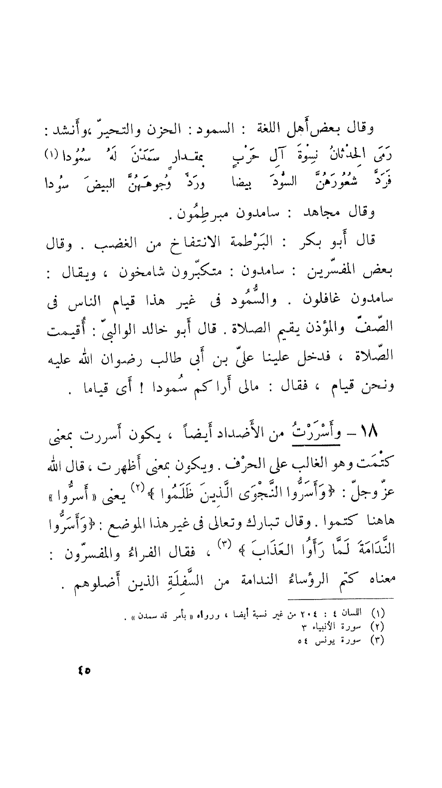 18 - وأَسْرَرْتُ من الأَضْداد أَيْضاً، يكون أَسررت بمَعْنَى كتَمْت وهو الغالب على الحرْف. ويكون بمَعْنَى أَظهرت، قال الله عزَ وجلّ: وأَسَرُّوا النَّجْوَى الَّذينَ ظَلَمُوا يعني أَسرُّوا هاهنا كتموا. وقالَ تبارك وتعالى في غير هذا الموضع: وأَسَرُّوا النَّدَامَةَ لَمَّا رَأُوا العَذَابَ، فقال الفَرَّاءُ والمفسِّرون: معناه كتم الرُّؤساء النَّدامة من السَّفِلَةِ الَّذين أَضلُّوهم.