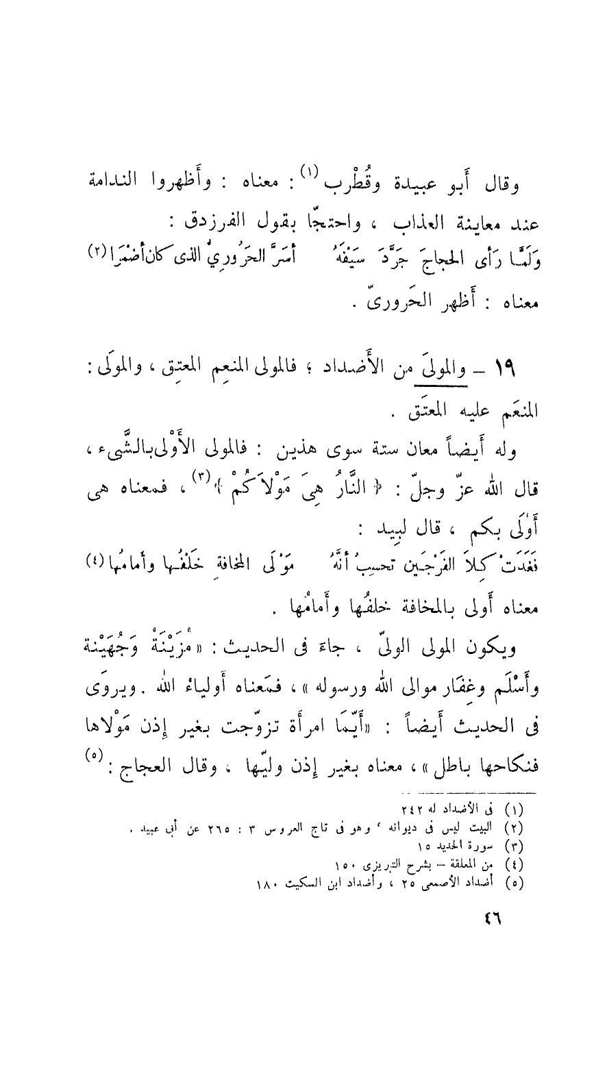 19 - والمولَى من الأَضْداد؛ فالمولَى المنعِم المعتِق، والمولَى: المنعَم عليه المعتَق. وله أَيْضاً معان ستَّة سوى هذين: فالمولَى الأَوْلى بالشَّيء، قال الله عزَ وجلّ: النَّارُ هِيَ مَوْلاَكُمْ، فمعناه هي أَوْلى بكم، قال لَبِيد: