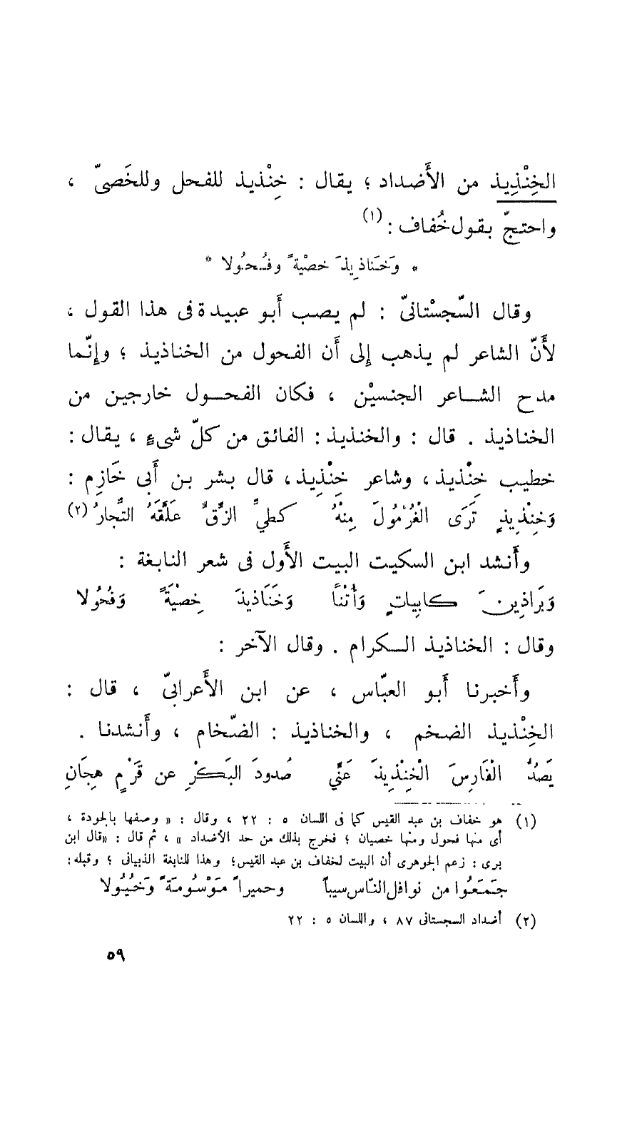 وقالَ السّجِستانيّ: لم يصب أَبو عُبيدة في هذا القول، لأنَّ الشَّاعِر لم يذهب إِلى أَنَّ الفحول من الخناذيذ؛ وإِنَّما مدح الشَّاعِر الجنسيْن، فكان الفحول خارجين من الخناذيذ. قال: والخِنْدِيذ: الفائق من كلِّ شيءٍ، يقال: خطيب خِنْدِيذ، وشاعر خِنْدِيذ، قال بشر بن أَبي خَازم: