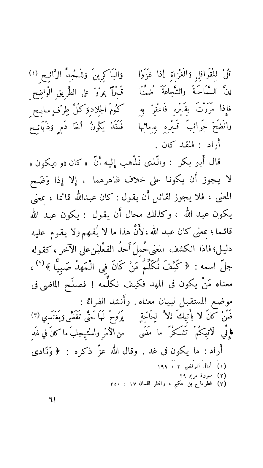 قال أَبو بَكْر: والَّذي نَذْهب إِلَيْه أَنَّ كان ويكون لا يجوز أَن يكونا على خلاف ظاهرهما، إِلاَّ إِذا وَضَح المعنى، فلا يجوز لقائل أَنْ يقول: كان عبد الله قائماً، بمَعْنَى يكون عبد الله، وكذلك محال أَنْ يقول: يكون عبد الله قائماً؛ بمَعْنَى كان عبد الله، لأنَّ هذا ما لا يُفهم ولا يقوم عليه دليل؛ فإِذا انكشف المعنى حُمِلَ أَحدُ الفعْليْن على الآخر، كقوله جلَّ اسمه: كَيْفَ نُكَلِّمُ مَنْ كَانَ في المَهْدِ صَبِيَّا، معناه مَنْ يكون في المهد فكيف نكلِّمه! فصلَح الماضي في موضع المستقبل لبيان معناه. وأَنشد الفَرَّاءُ: