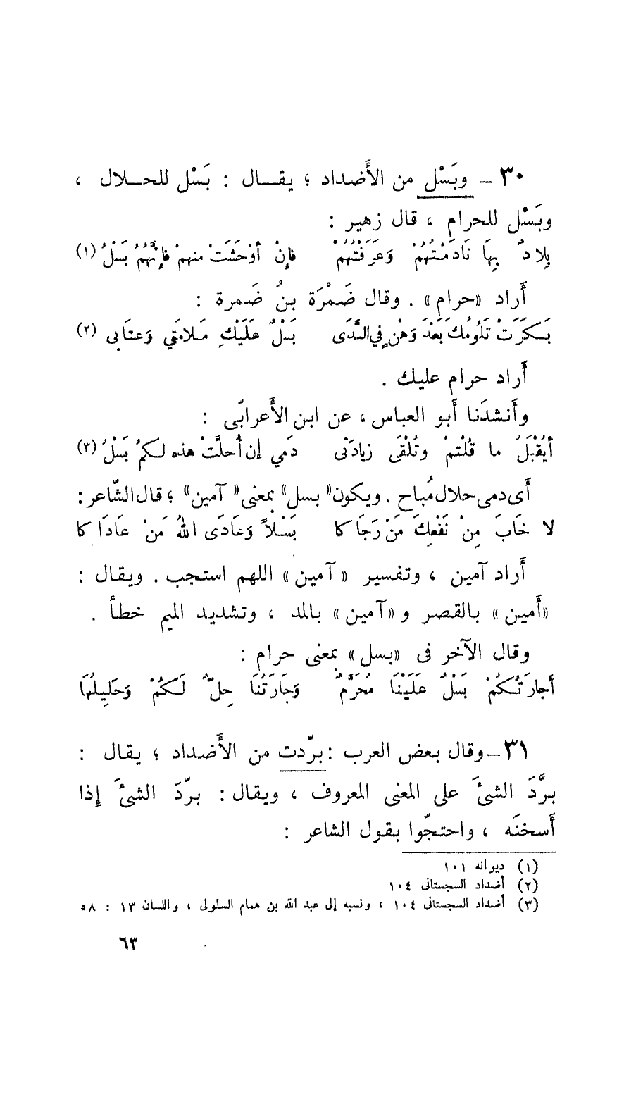 31 - وقالَ بعض العرب: برّدت من الأَضْداد؛ يقال: برَّدَ الشَّيْءَ على المعنى المعروف، ويقال: برَّدَ الشَّيْءَ إِذا أَسخَنه، واحتجُّوا بقول الشَّاعِر: