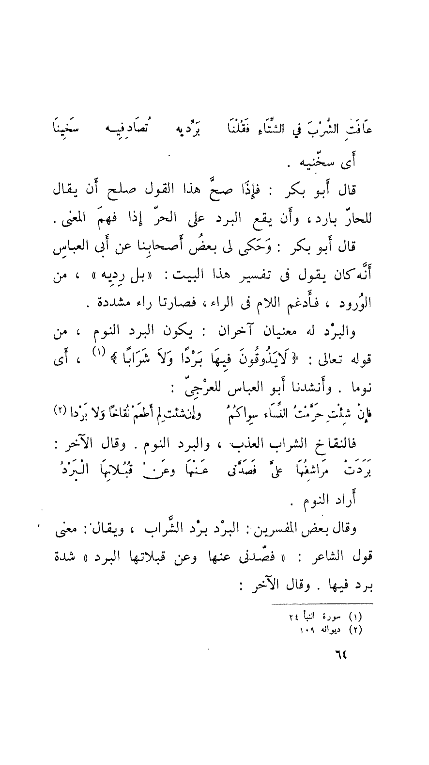 أَرادَ النوم. وقالَ بعض المفسِّرين: البرْد برْد الشَّراب، ويقال: معنى قول الشَّاعِر: فصدَّني عنها وعن قبلاتها البرد: شدَّة برد فيها. وقال الآخر: