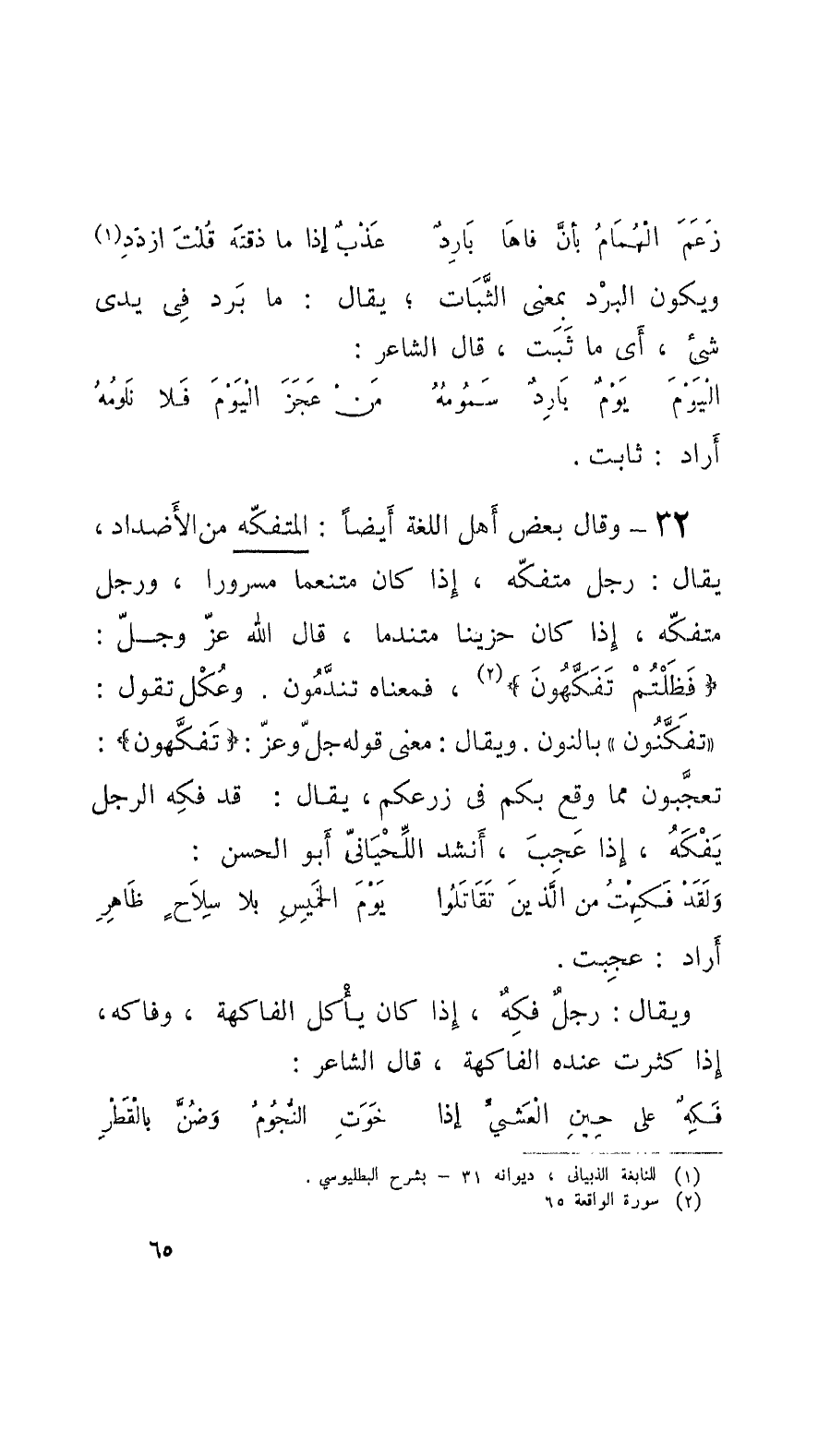 32 - وقالَ بعض أَهل اللُّغة أَيْضاً: المتفكّه من الأَضْداد، يقال: رجل متفكّه، إِذا كان متنعّماً مسروراً، ورَجُلٌ متفكّه، إِذا كان حزيناً متندِّماً، قال الله عزَ وجلّ: فَظَلْتُمْ تَفَكَّهُونَ، فمعناه تندَّمُون. وعُكْل تقول: تَفَكَّنُون بالنُّون. ويقال: معنى قوله جلَّ وعزَّ: تَفَكَّهون: تعجَّبون ممَّا وقع بكم في زرعكم، يقال: قد فكِه الرَّجل يَفْكَهُ، إِذا عَجِبَ، وأَنْشَدَ اللِّحْيانِيّ أَبو الحسن: